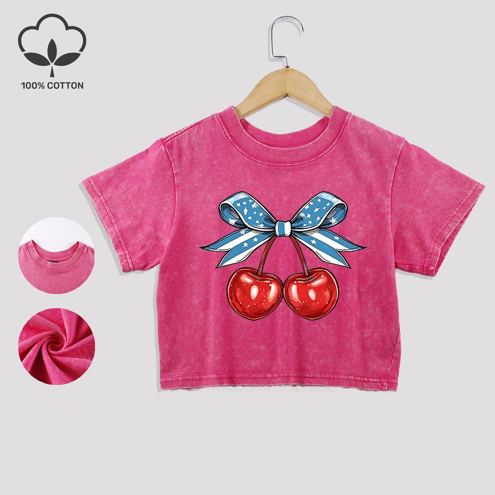 Футболки из хлопка с принтом в виде вишни и банта-флага, модные летние кроп-топы с кружевной отделкой, обычного кроя, с круглым вырезом, повседневная одежда