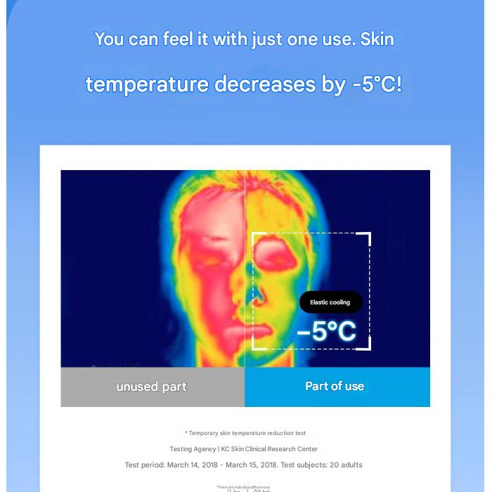 • Мгновенное охлаждение до −5 °C – Доказано, что немедленно снижает температуру кожи (Тест Исследовательского центра дерматологии KC, 2018.03.14–15, 20 участников)