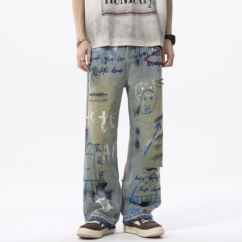 Новые американские уличные граффити рваные крашеные джинсы мужские прямые свободные широкие штанины