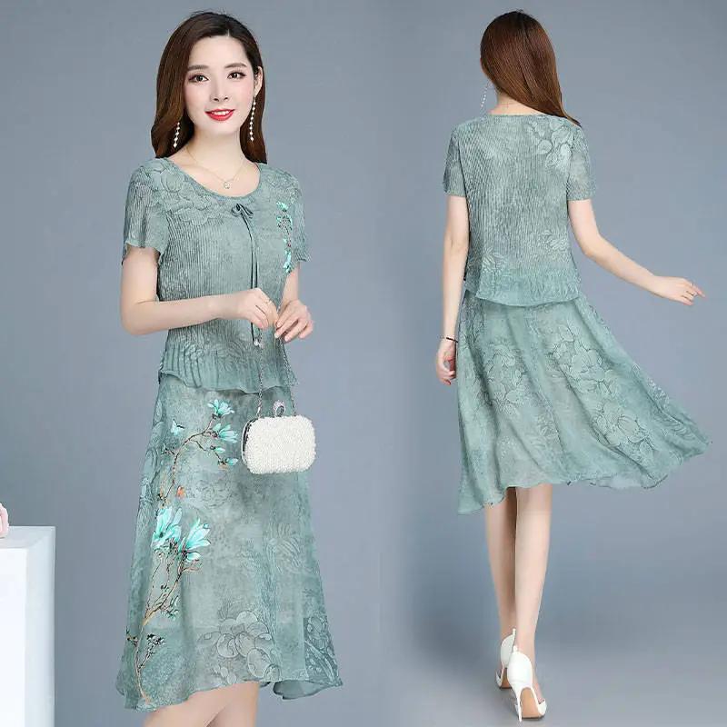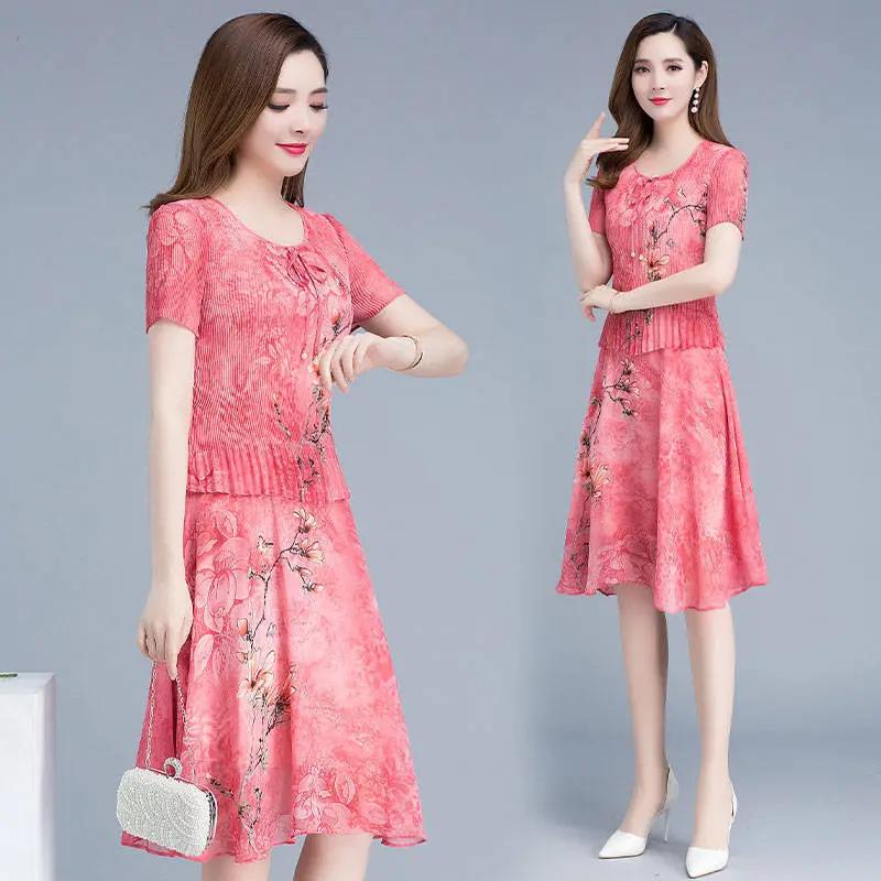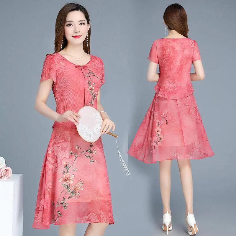 Женское летнее элегантное шифоновое платье с круглым вырезом, большого размера, с принтом, приталенное, длиной до колена.