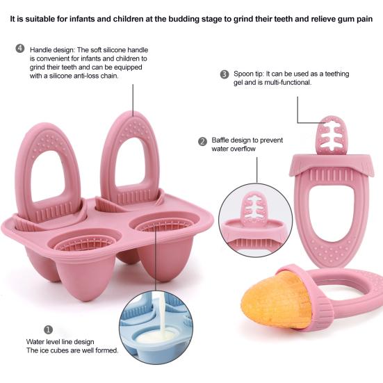 Удобный для детей дизайн: Эти формы для эскимо, разработанные специально для малышей, поддерживают самостоятельное питание и рост.. Гибкая силиконовая ручка с бусинами обеспечивает устойчивый захват для маленьких ручек и служит успокаивающим прорезывателем для десен.. Широкий поддон для капель минимизирует беспорядок, а мягкий, но прочный силиконовый стержень надежно фиксирует эскимо.. Текстурированные поверхности помогают облегчить боль в деснах и стимулировать язык.