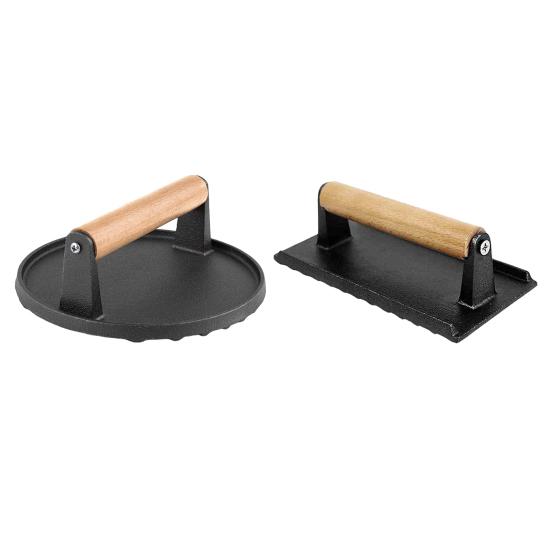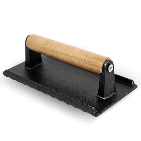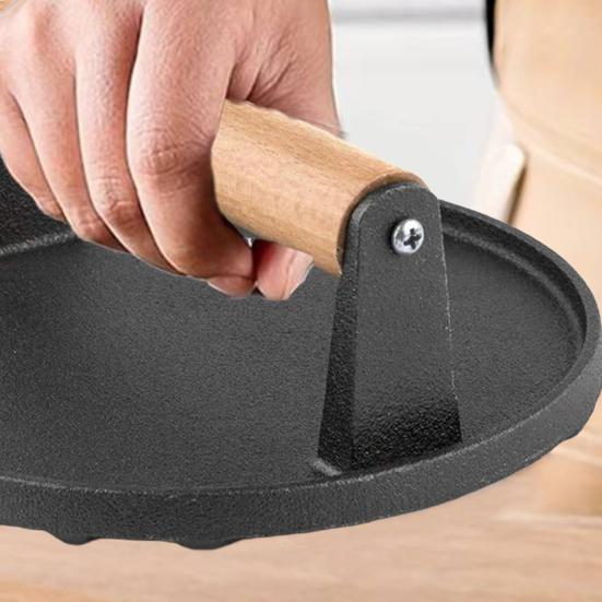 Экономьте время на приготовление пищи с нашим универсальным прессом для мяса! Этот плоский пресс для гриля, изготовленный из прочного чугуна, обеспечивает равномерное распределение тепла при нажатии на мясо, что значительно сокращает время приготовления.. Практичная деревянная ручка обеспечивает удобный и безопасный захват, гарантируя изоляцию от тепла..