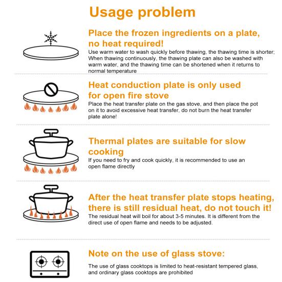 Многоцелевая утилита: Помимо рассеивания пламени на газовых плитах, этот универсальный инструмент также выполняет функцию поддона для размораживания.. Совместимость с различными материалами кастрюль, такими как металл, эмаль, медь, стекло и т. д., обеспечивает большую гибкость при приготовлении пищи в различных ситуациях.