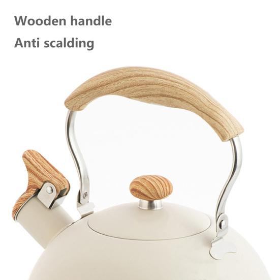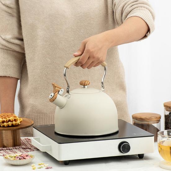 Представляем наш чайник со свистком объемом 2,5 л, изготовленный из высококачественной пищевой нержавеющей стали, обеспечивающей устойчивость к ржавчине и эффективную теплопроводность.. Вскипятите воду быстрее благодаря равномерно нагретому дну, которое идеально подходит для удовлетворения потребностей вашей семьи в питье за один раз.. Этот чайник прост в использовании, имеет эргономичную деревянную ручку для удобного захвата и перевернутый носик для безопасного налива горячей воды.