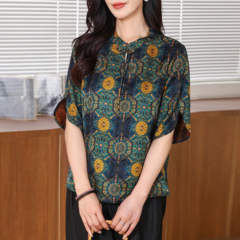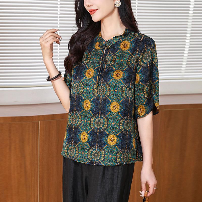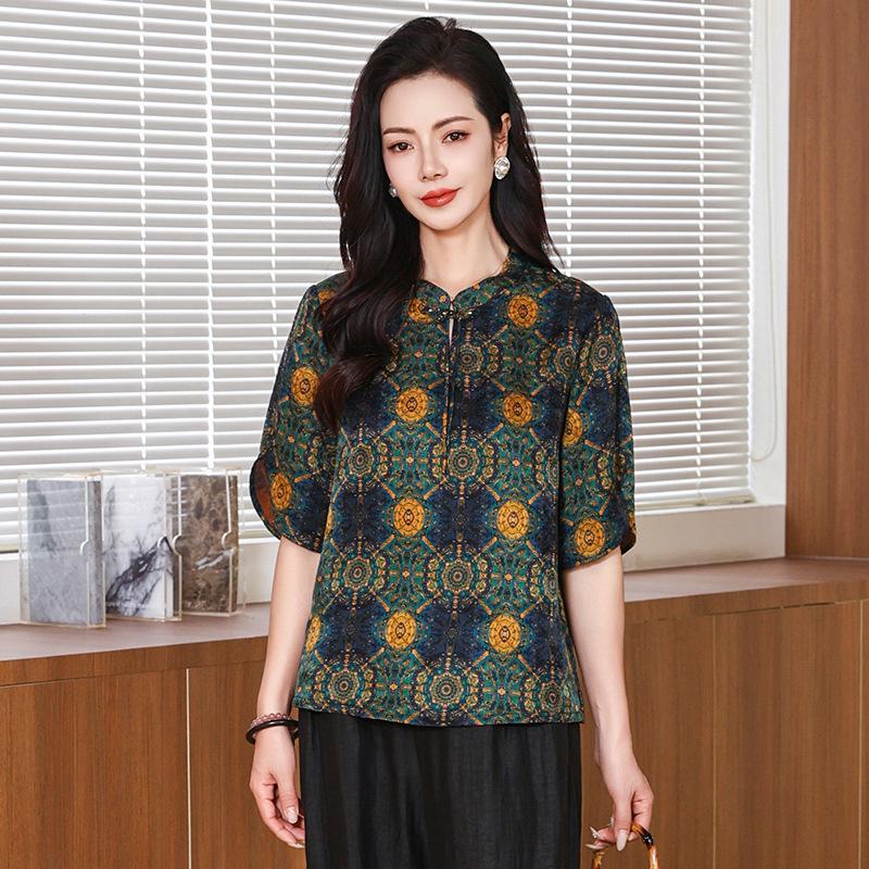 Рубашка из ароматной облачной пряжи хуало, наряд для мамы, летняя, в стиле ретро, с воротником-стойкой, шелковая рубашка со средним рукавом, шелковый топ для женщин