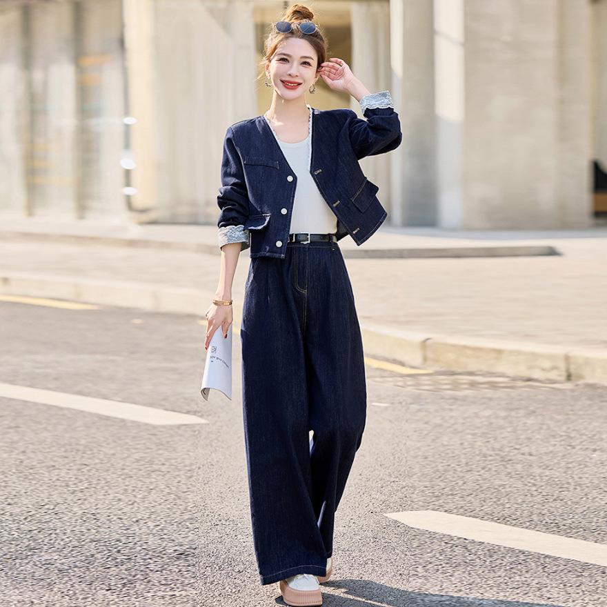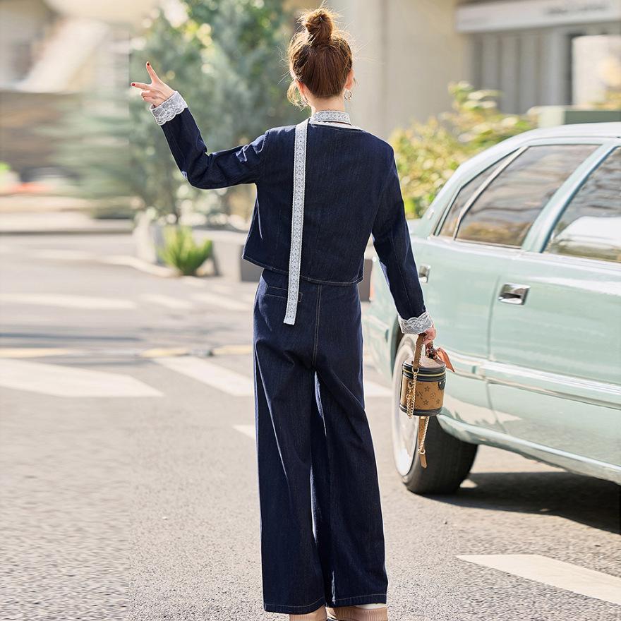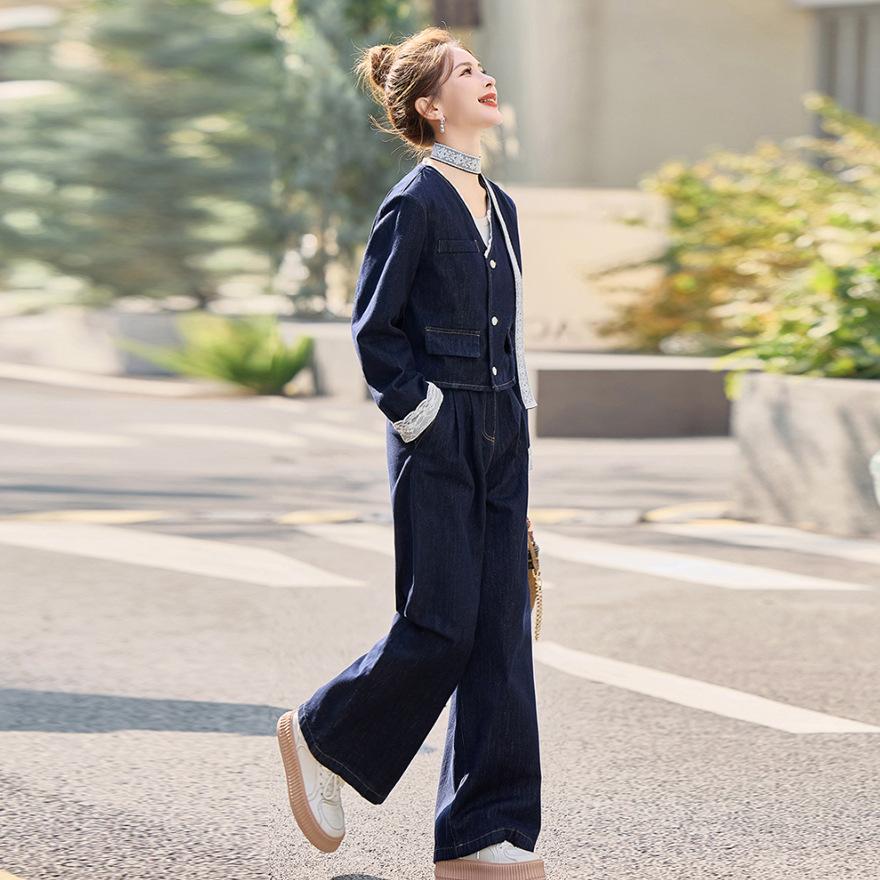 Джинсовый костюм женский весна и осень новый модный темпераментный дизайн чувство темперамент жареная улица широкие брюки комплект из двух предметов