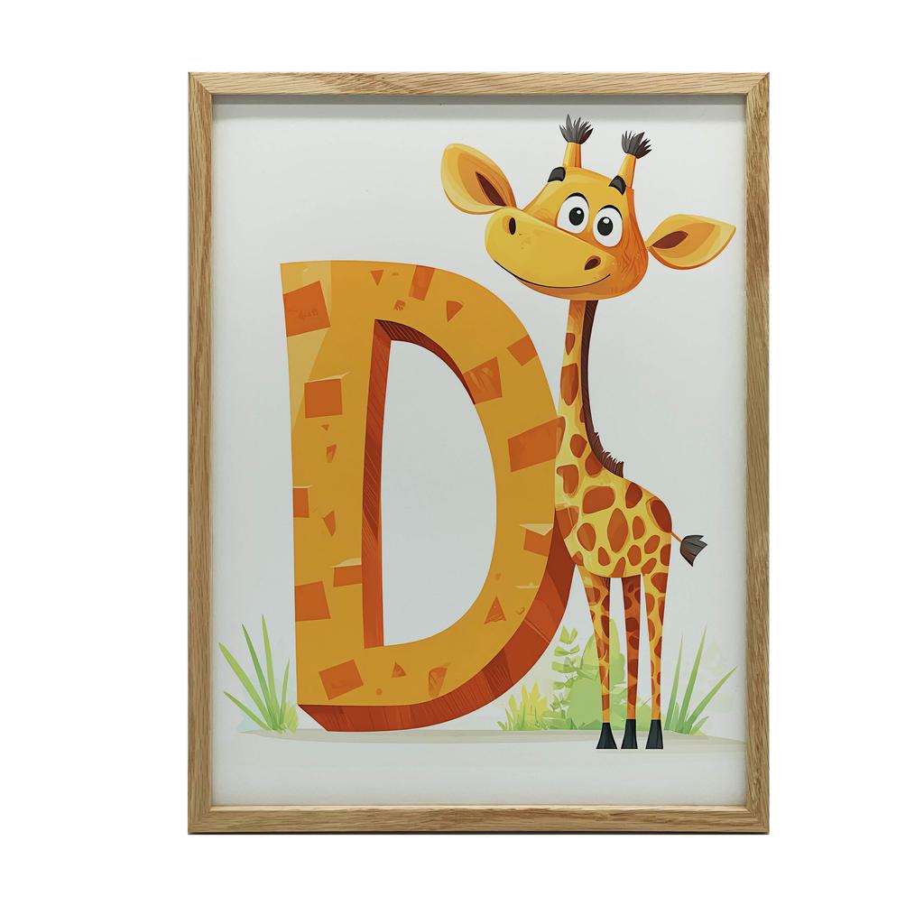 1x Plakat Żyrafa z literą D, 30x40 cm, rama drewniana jasny dąb, papier matowy 230 gsm