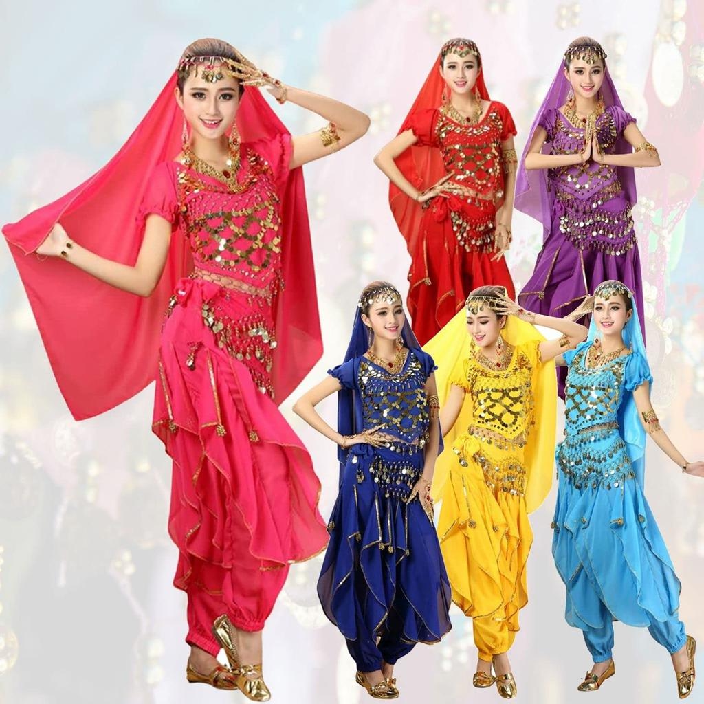 Это комплект из четырех частей, состоящий из вуали с аксессуарами, топа, поясного платка с аксессуарами и юбки-брюк.