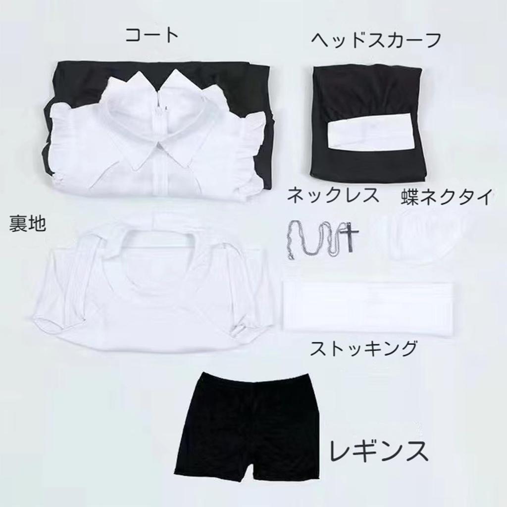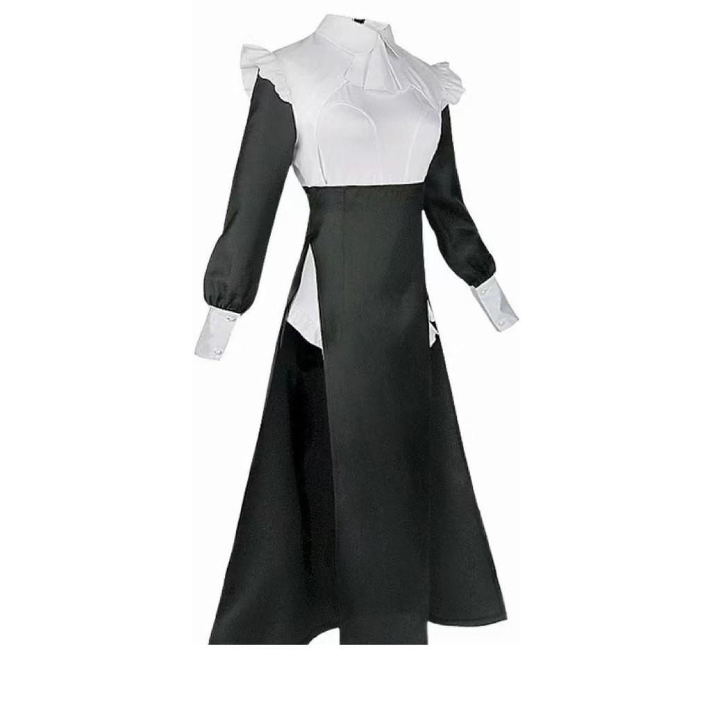 Полный комплект: Комплект из 7 предметов, включающий белую подкладку, черно-белую тунику, головной платок, ожерелье, галстук-бабочку, чулки и низ.