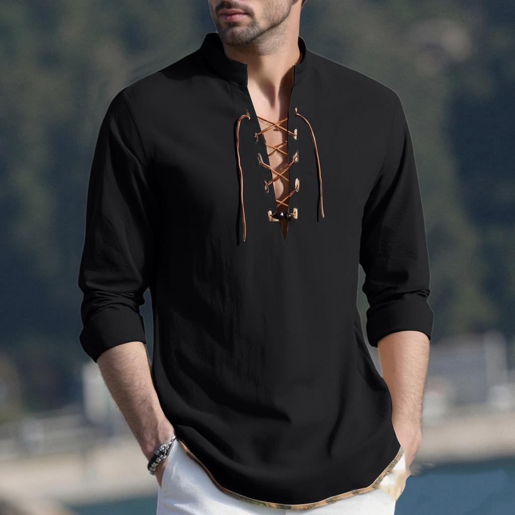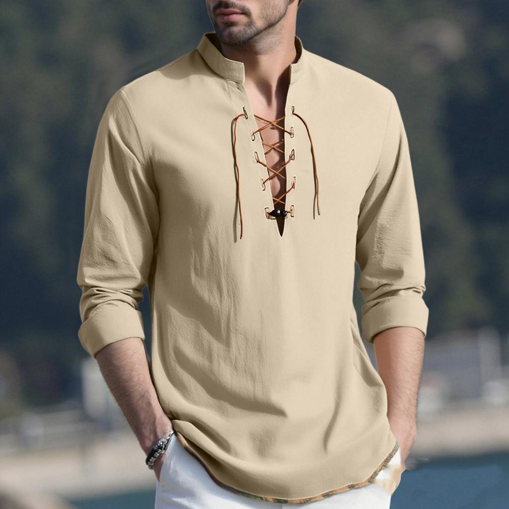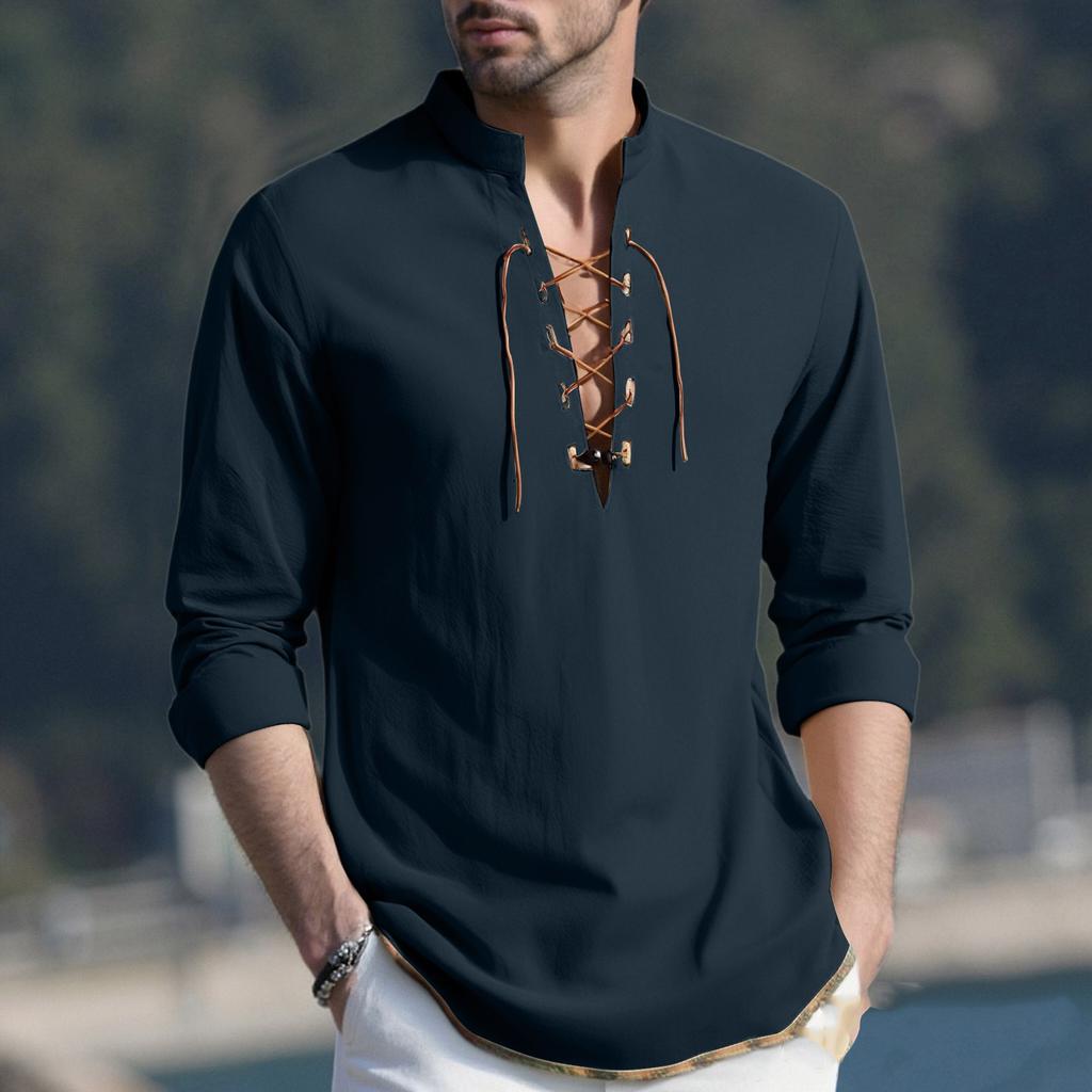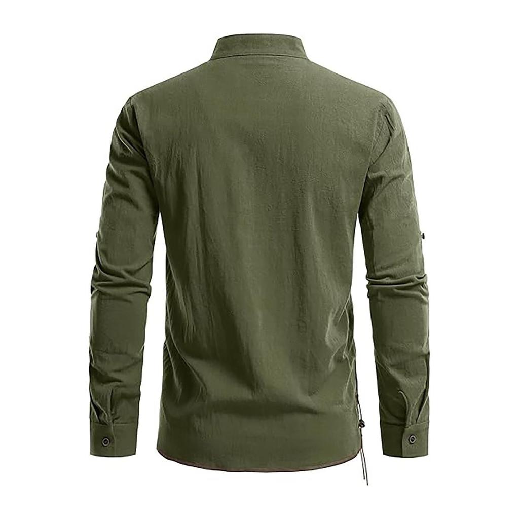 Мужской повседневный и модный хлопково-льняной однотонный с круглым вырезом и длинными рукавами