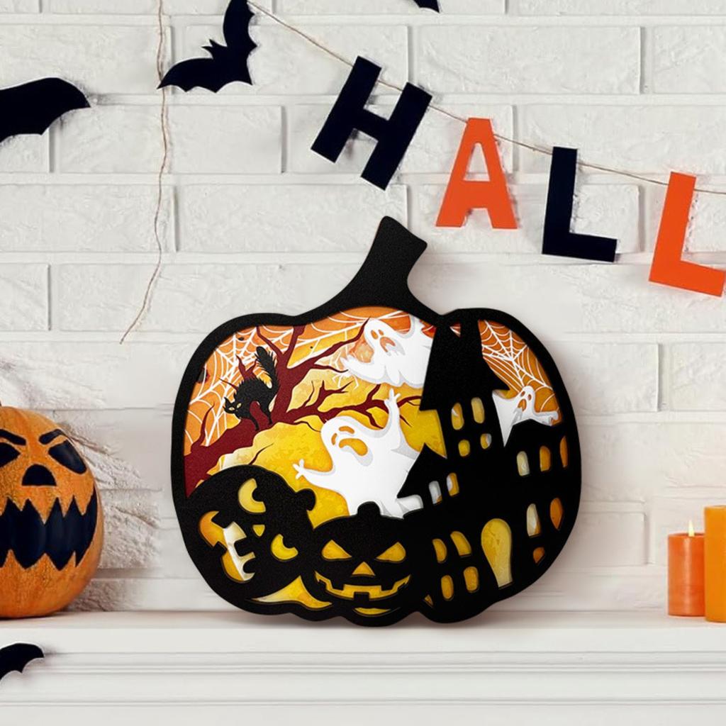 Halloween Pumpkin Wooden Ornament, American Holiday Party 3D Hollow Decoration Atmosphere Ornament
