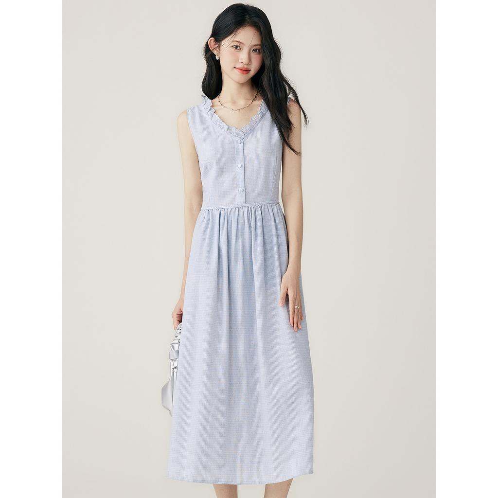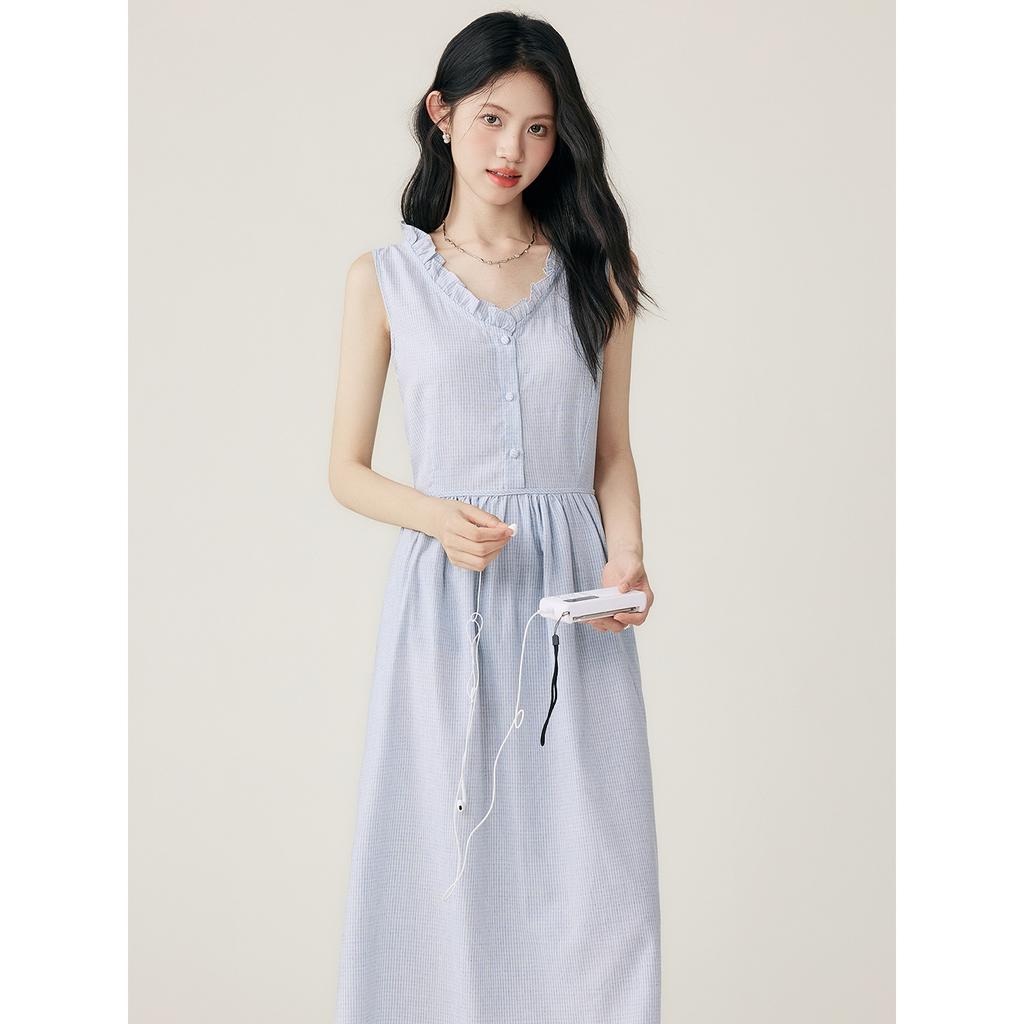 Летнее синее клетчатое кружевное платье-жилет без рукавов средней и длинной длины женское