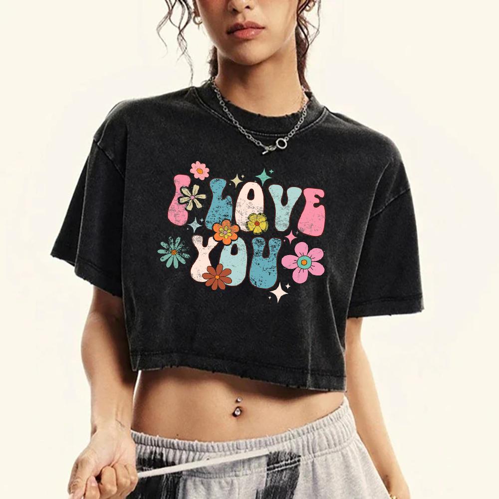 Я Люблю Тебя Красочные Буквы Принты Цветов Женские Укороченные Выстиранные Футболки Уличные Футболки с Коротким Рукавом Облегающая Хлопковая Одежда