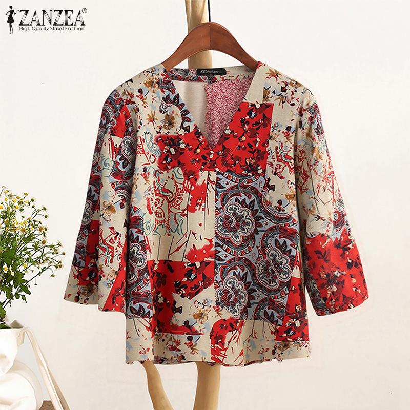 ZANZEA Женская повседневная блузка с V-образным вырезом, свободного кроя, с рукавом 3/4 и принтом