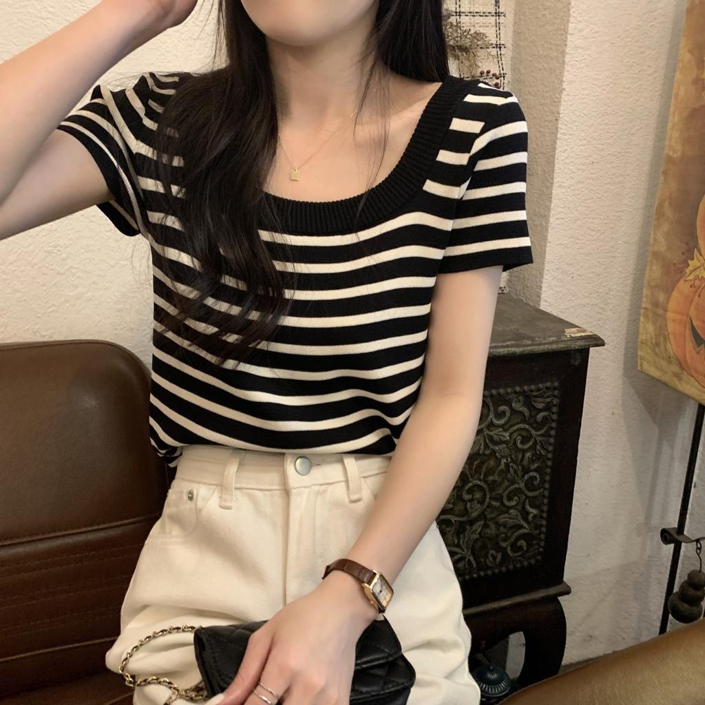 Летний новый темпераментный квадратный вырез полосатый универсальный вязаный свитер футболка с коротким рукавом топ женский
