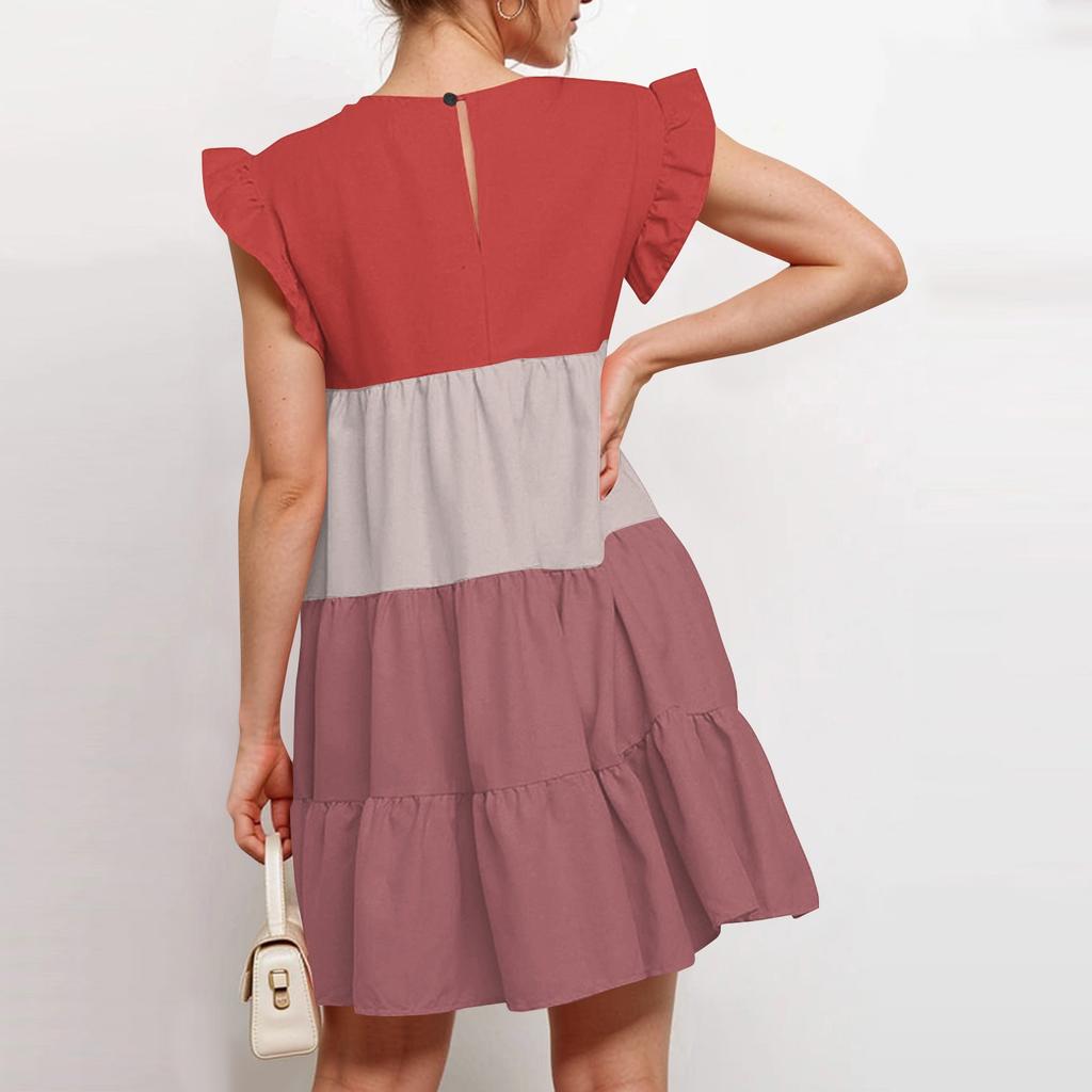 Женская мода лето повседневный О-образный вырез рукав оборки без рукавов струящаяся короткая туника платье