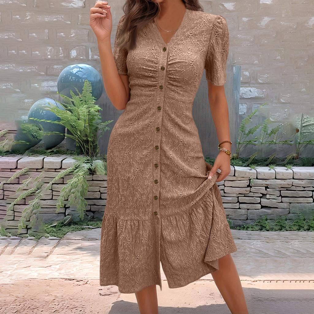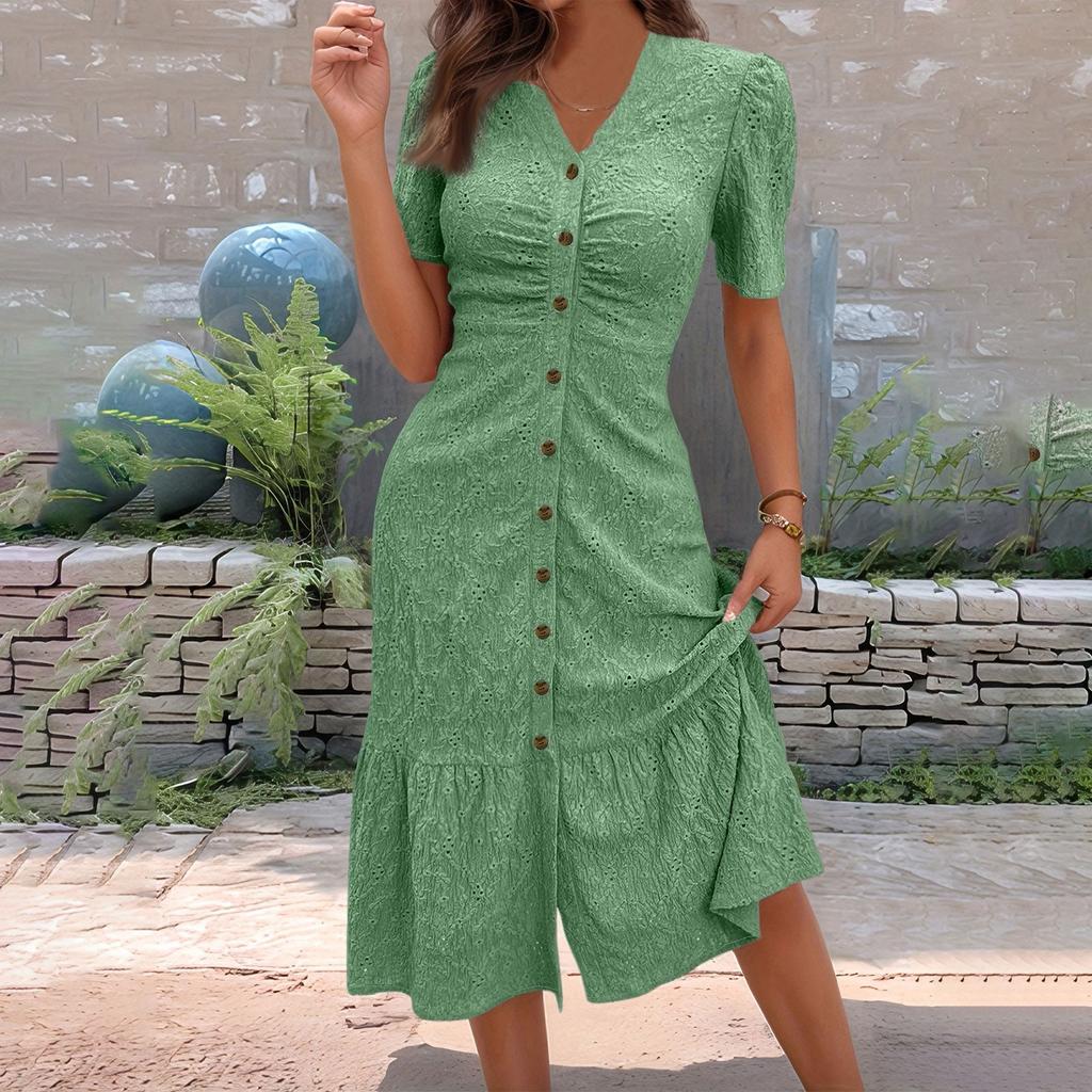 Женское модное платье с круглым вырезом, короткими рукавами, однотонное, на пуговицах