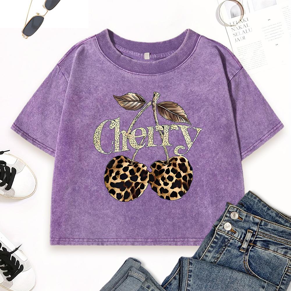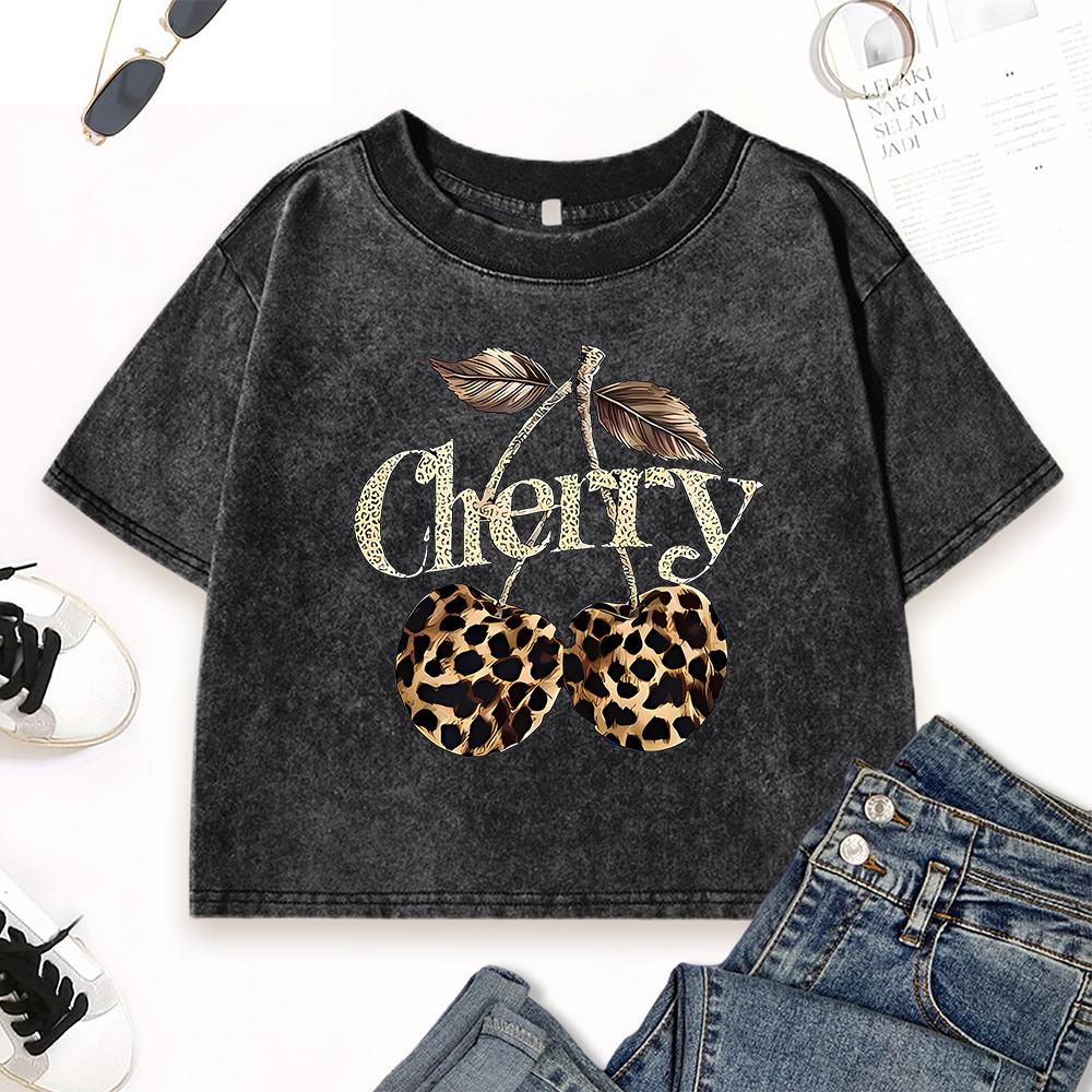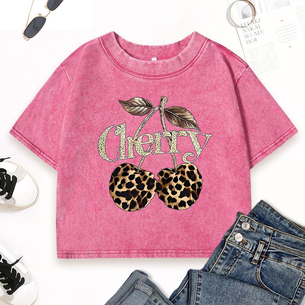 Футболка с принтом вишни и текстурой леопарда, женская, с круглым вырезом, укороченная, с коротким рукавом, из хлопка, повседневная