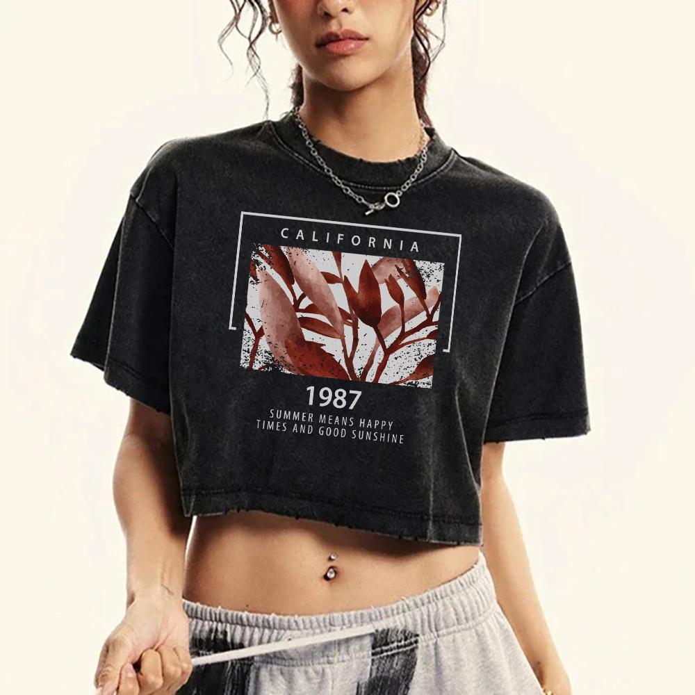 Калифорния 1987 Футболка женская укороченная с принтом цветов, выстиранная, в стиле ретро, с круглым вырезом, с коротким рукавом, модная одежда, летний фитнес-топ