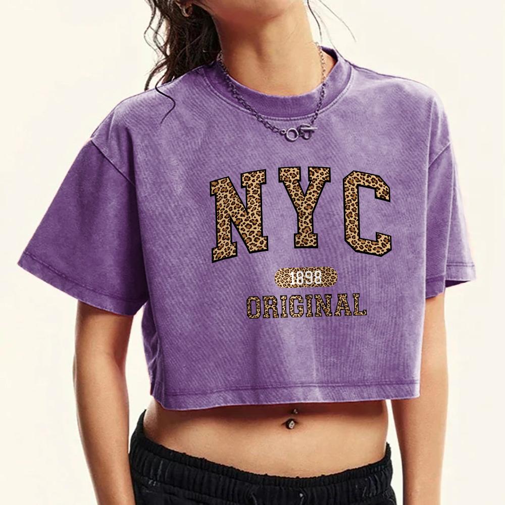 Футболка женская укороченная с принтом леопарда и Нью-Йорка, выстиранная, летняя, с коротким рукавом, из мягкого хлопка, с круглым вырезом