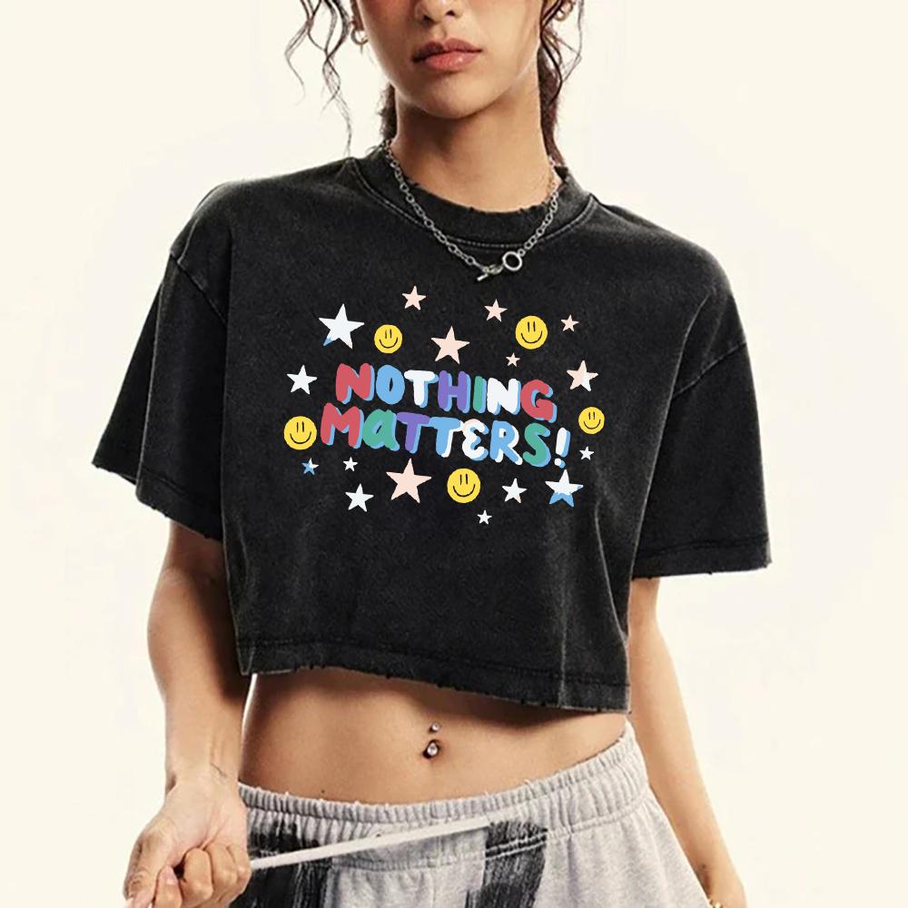 Ничего не имеет значения Цветная надпись Звезда Принт Женская выстиранная футболка Приталенная одежда Хлопок Уличные футболки Фитнес Короткий рукав
