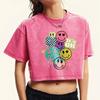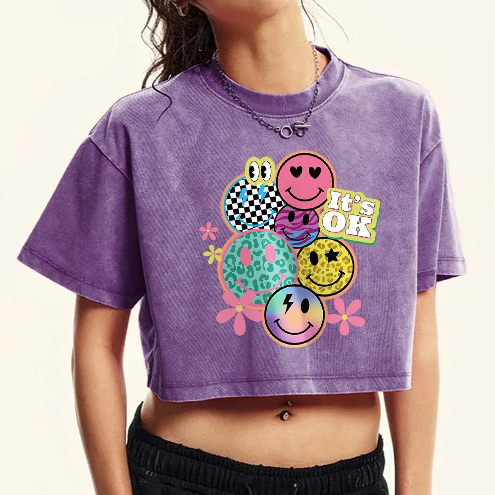 Всё в порядке Счастливое лицо Цветочный принт Выстиранная укороченная футболка Женская мода Хлопковые футболки Многоцветная Повседневная одежда Топы