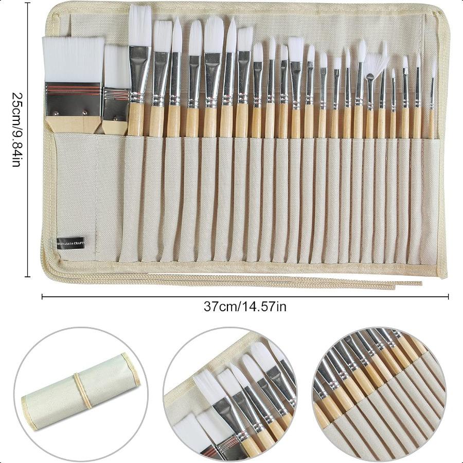 Набор кистей для рисования из 24 штук, кисти с деревянными ручками и холщовым чехлом для кистей, профессиональные для живописи маслом, акрилом и акварелью