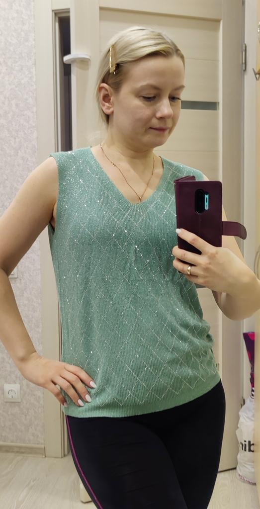 Маечка супер! Цвет зелёный, на фото продавца мне казалась ближе к голубому. Красивая, блестит. Спасибо!
