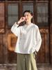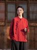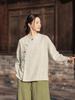Женская рубашка ретро из льна Весна/Лето 2025 со стойкой, боковой планкой, колор-блоком, песочной стиркой, пуговицей-лягушкой и длинными рукавами.