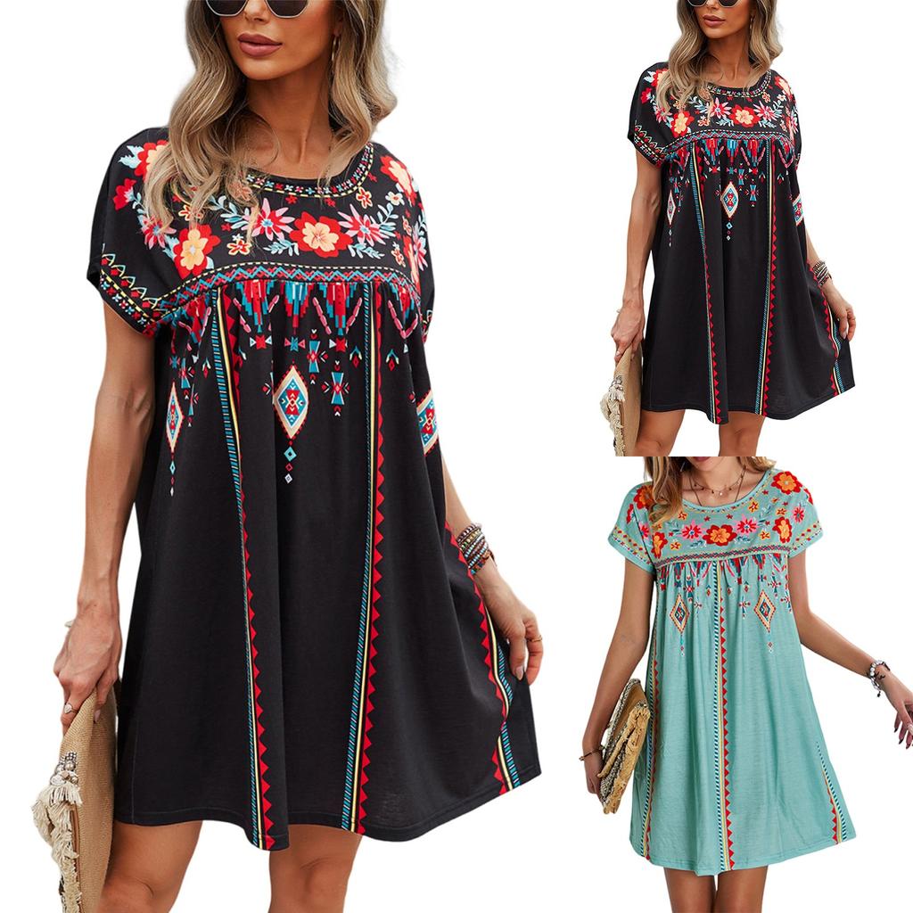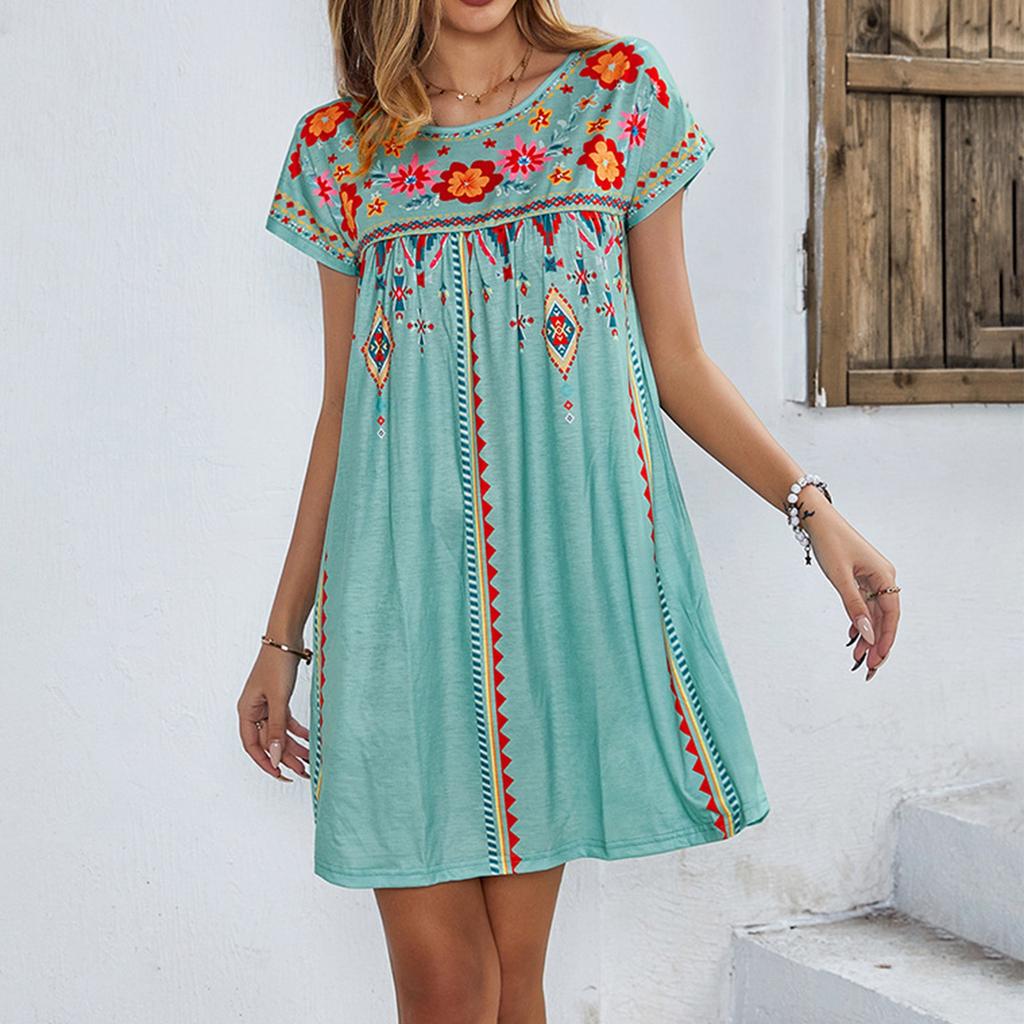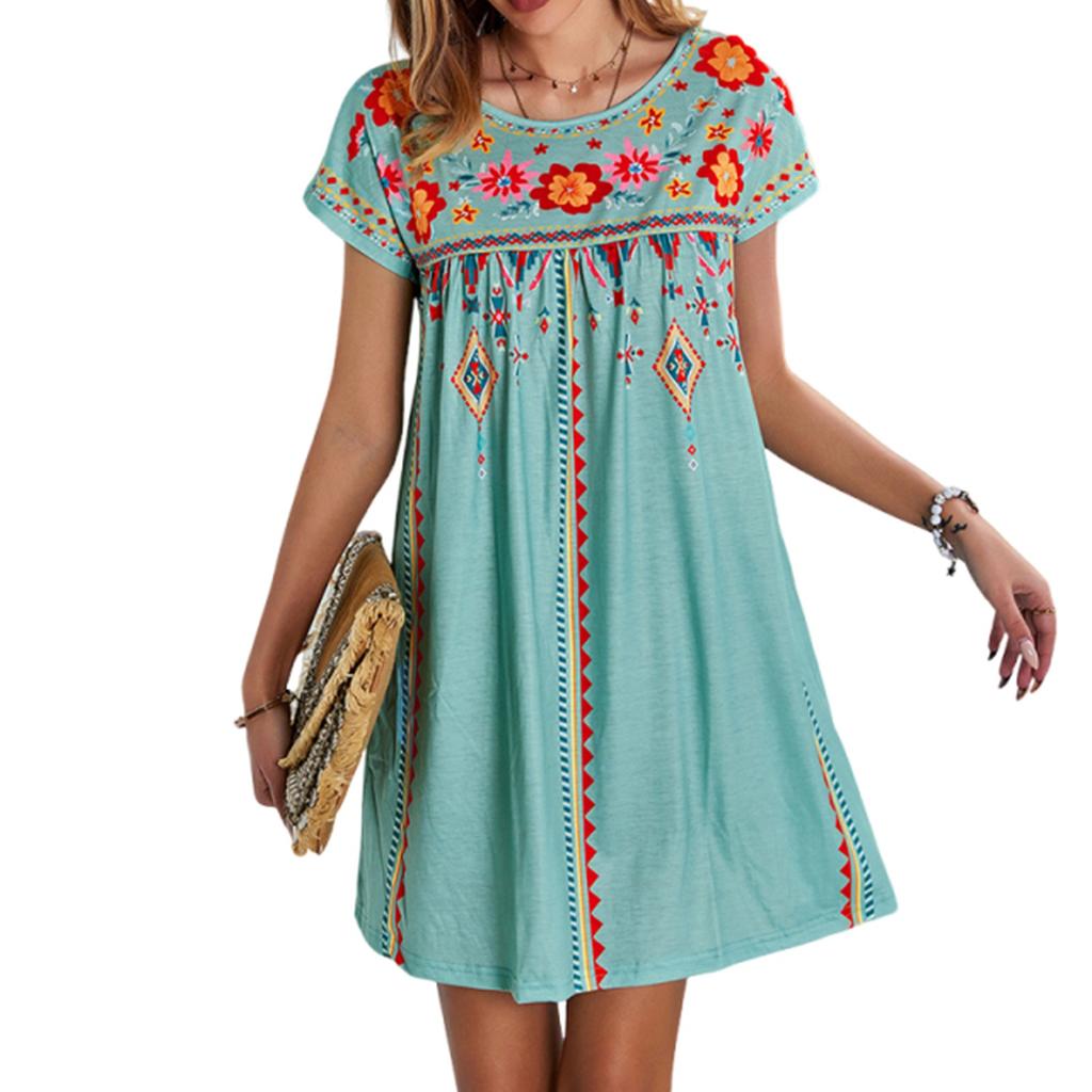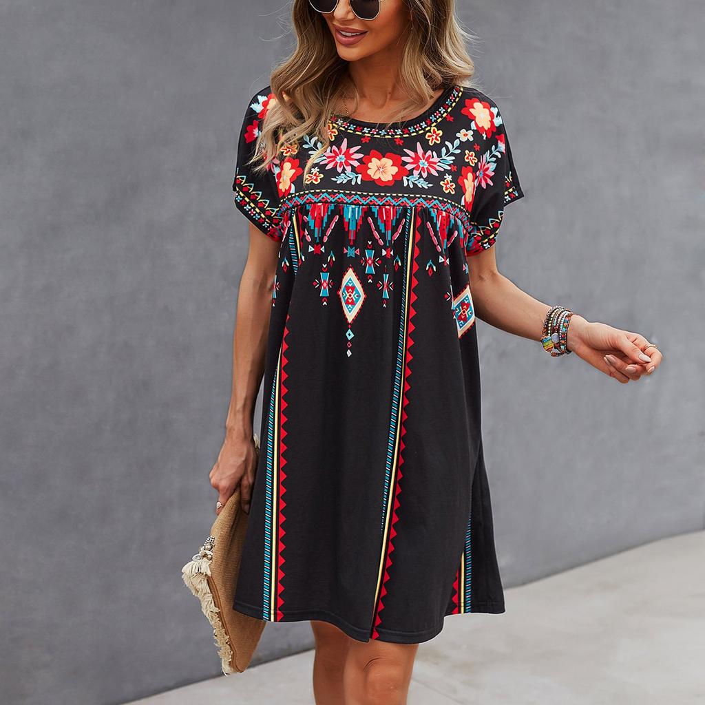 Женское платье повседневное с круглым вырезом и винтажным цветочным принтом с короткими рукавами