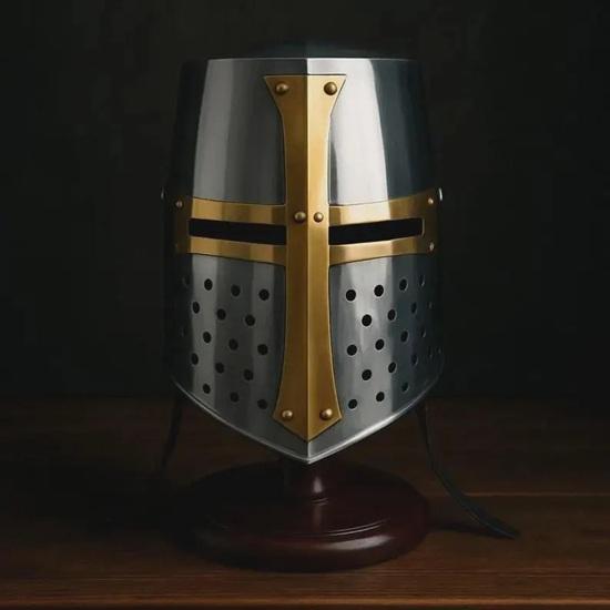 Стиль: Классический шлем рыцаря-крестоносца с наносником и передним крестом.