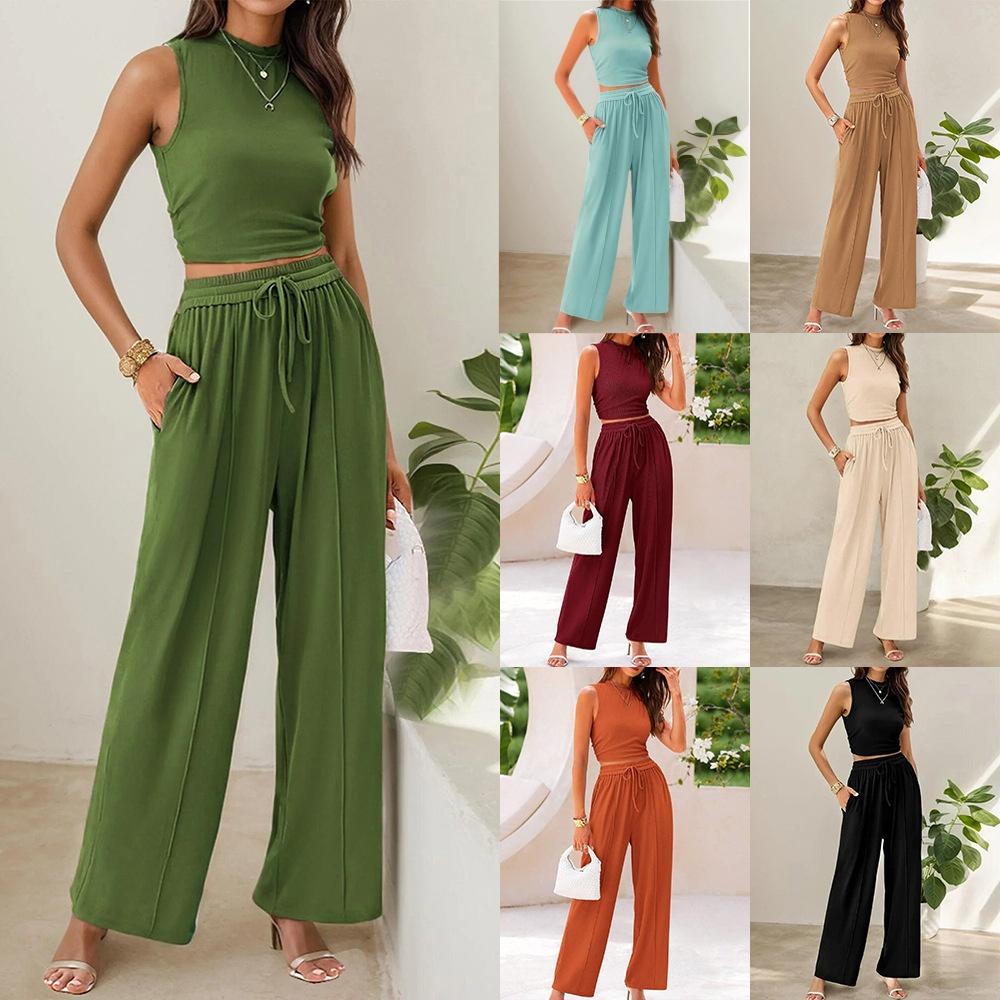 Летний вязаный повседневный костюм 2025 года, топ без рукавов с круглым вырезом, короткий облегающий, брюки с широкими штанинами, комплект из двух предметов