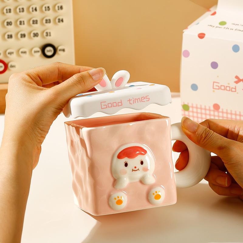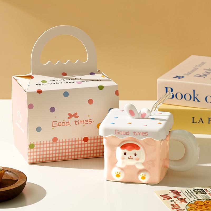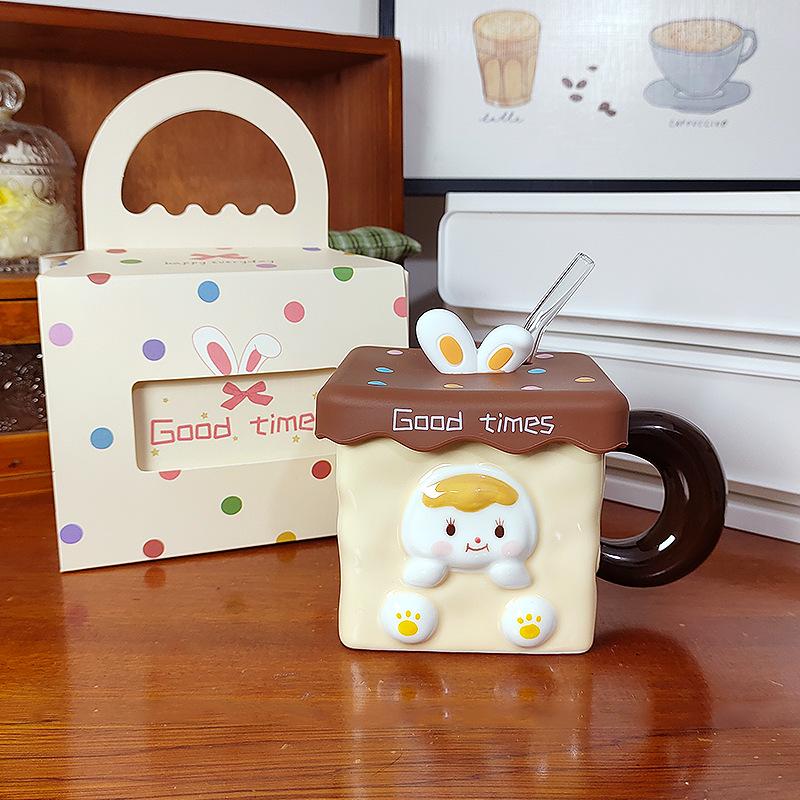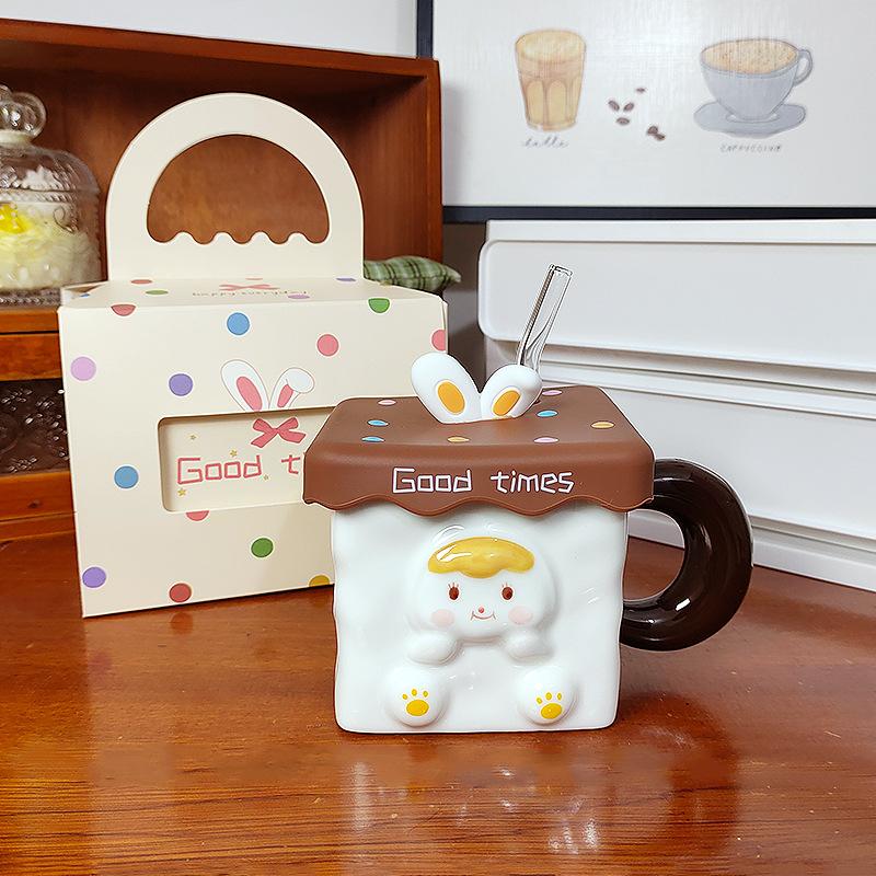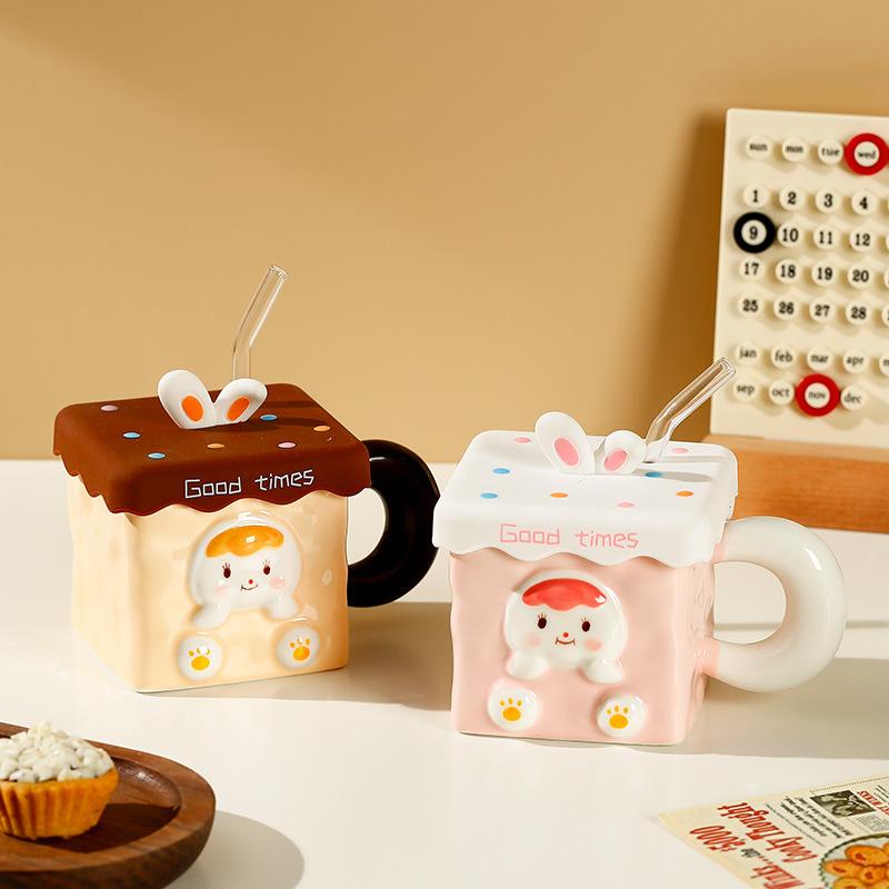 Милая трехмерная кружка с кроликом, с крышкой и соломинкой, креативный подарок для девушки, квадратная керамическая кружка для завтрака, для офиса