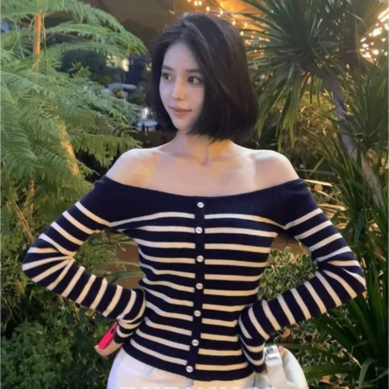 Вязаный свитер с длинным рукавом на одно плечо в полоску, облегающий базовый слой для женщин