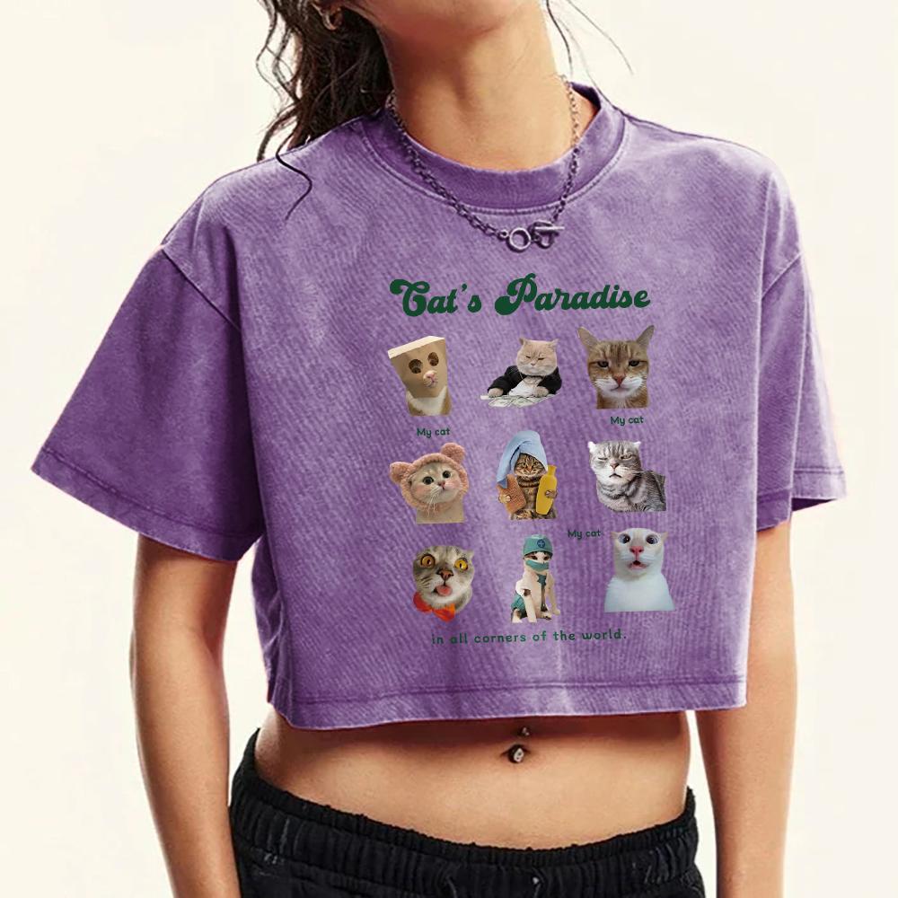 Милая коллекция кошек Принт Выстиранная футболка Женская Ретро Повседневная футболка Фитнес Кроп-топ Одежда Летняя мода