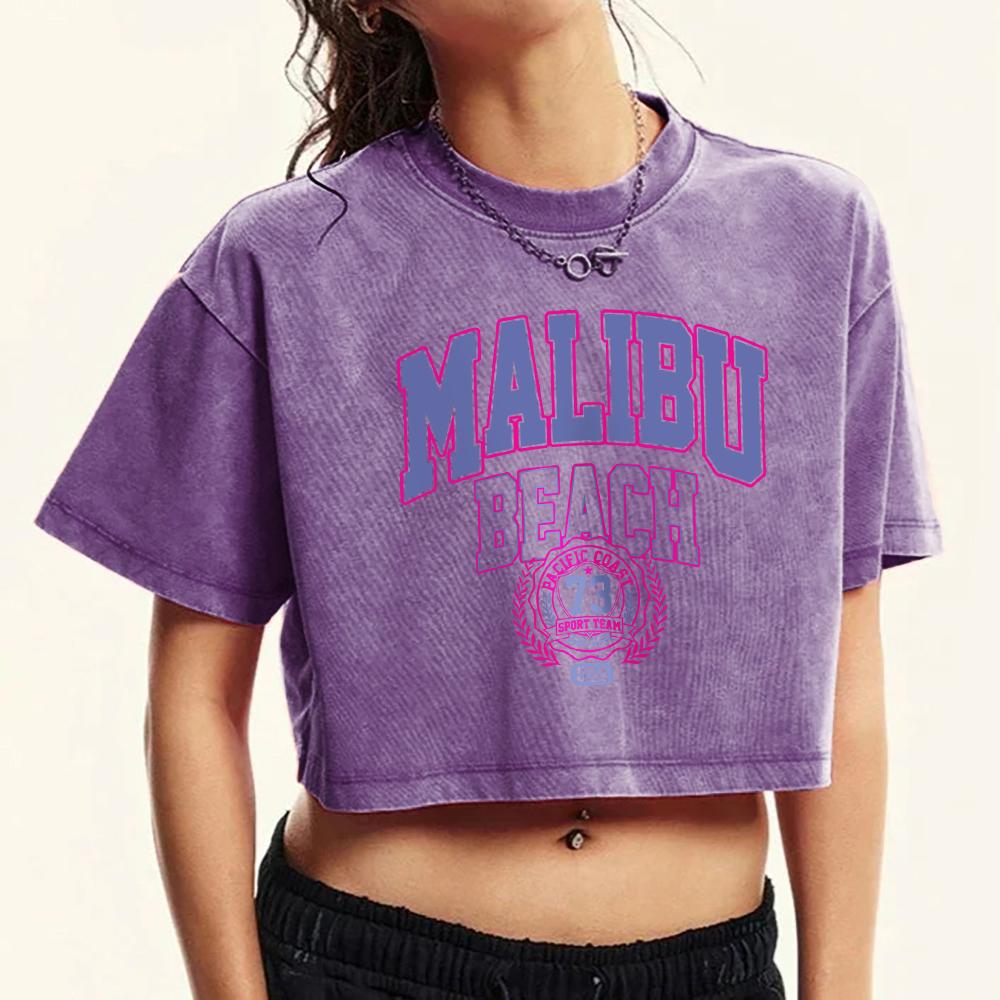 Ретро Искусство Пляжа Малибу Женская Укороченная Футболка с Принтом Букв, Хлопковая Футболка с Круглым Вырезом, Уличная Одежда, Облегающая, С Коротким Рукавом