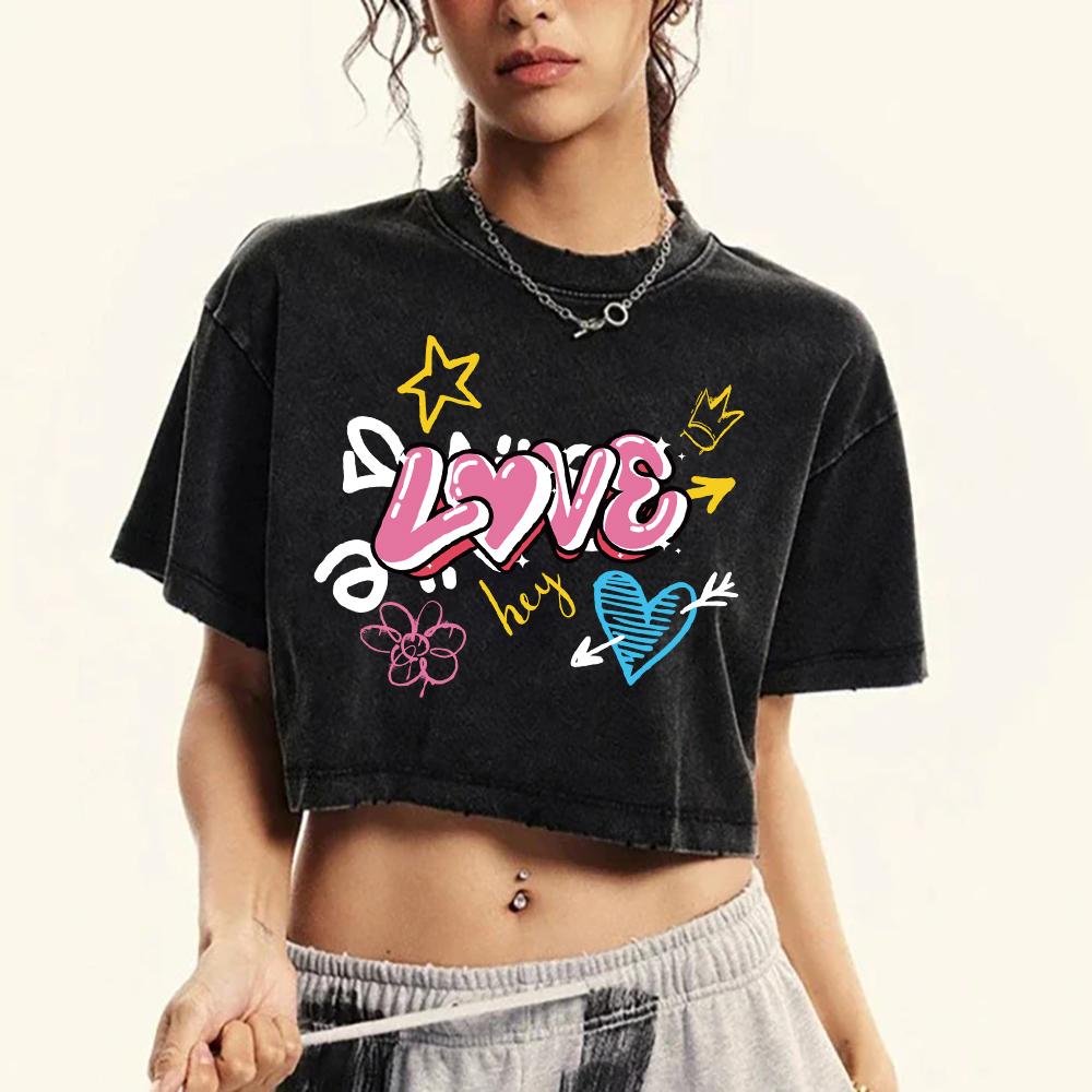 Мультяшный Принт Любовь Искусство Выстиранная Футболка Женская Мода Укороченные Выстиранные Футболки Хлопок Летние Топы Короткий Рукав Женская