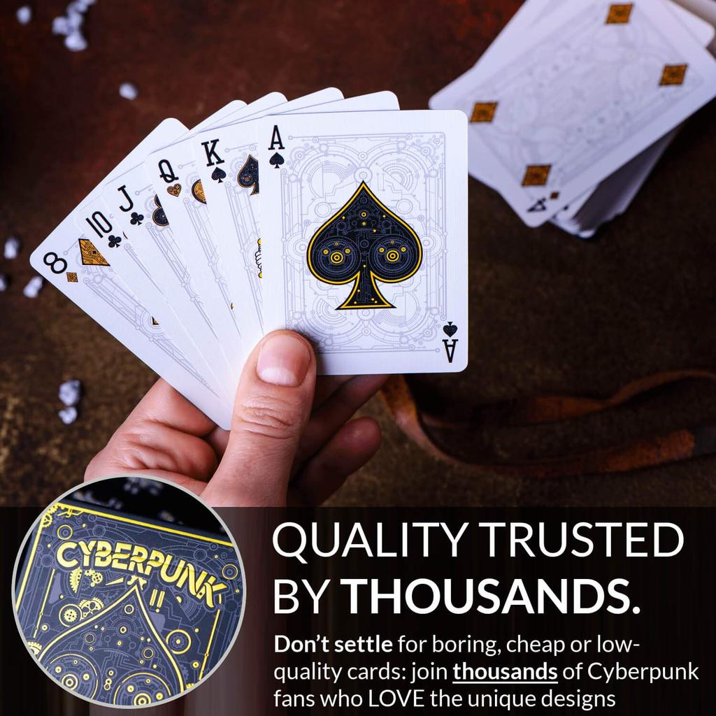 ИНТРИГУЮЩИЙ, ФУТУРИСТИЧНЫЙ ДИЗАЙН - Сделайте свою следующую раздачу стильной с этими потрясающими игральными картами в стиле киберпанк. Оригинальное нарисованное от руки произведение искусства демонстрирует дистопическую смесь индустриального и высокотехнологичного через мрачные уличные сцены и темных футуристических персонажей, и все это представлено в коллекционной подарочной коробке с яркими фольгированными акцентами.