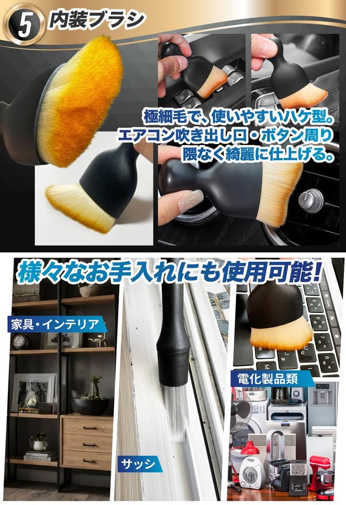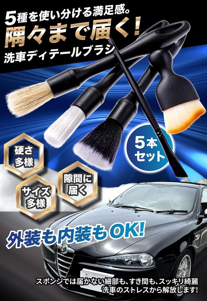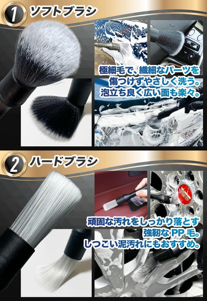 [Пять щеток для мытья автомобиля в одном наборе] Этот набор включает пять щеток для различных целей. Они включают мягкую щетку, щетку средней жесткости, щетку для удаления стойких загрязнений, маленькую щетку для детальной очистки и специализированную щетку для чистки салона.. Каждая кисть имеет разную щетину и размеры, что делает ее подходящей для широкого спектра применений, от экстерьера до интерьера.. [Удаляет мелкую грязь] Эта кисть-щетка идеально подходит для труднодоступных мест, куда не могут добраться губки, таких как эмблемы, колесные гайки, решетки радиатора и зазоры фар.. Гибкая щетина проникает в зазоры для эффективного удаления грязи. Это также полезно для очистки внутренних зон, таких как вентиляционные отверстия кондиционера и дверные карманы.. [Гибкая для уменьшения царапин на краске] Мягкая щетка использует ультратонкие волокна, что делает ее безопасной для деликатного кузова и прозрачных деталей. Кисть средней жесткости рекомендуется для участков вокруг фар и эмблем, а жесткая кисть рекомендуется для стойких загрязнений, таких как тормозная пыль на колесах и вокруг болтов.. Щетина подобрана для каждой области, что позволяет мыть машину, не создавая излишней нагрузки на нее.. [Высокопрочный и многоразовый] Компактная конструкция позволяет всем пяти картриджам поместиться в специальную сумку для хранения. Храните все инструменты для мойки автомобиля вместе.