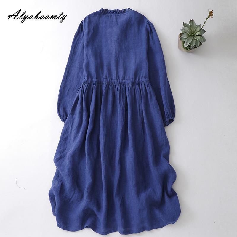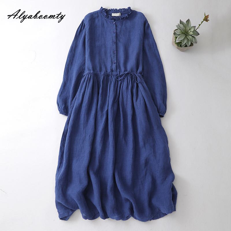 Японское платье миди Mori Girl весна-осень для женщин, темно-синее платье со шнуровкой и оборками, с длинным рукавом, винтажное элегантное хлопковое платье