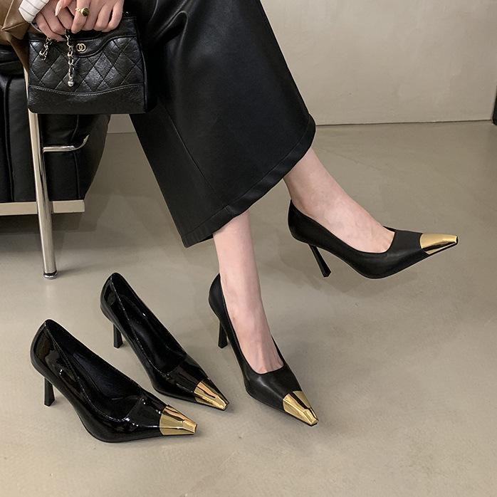 Женские весенние туфли на каблуке с одной ступней, остроносые, на шпильке, элегантные, в тон, черные, на высоком каблуке.