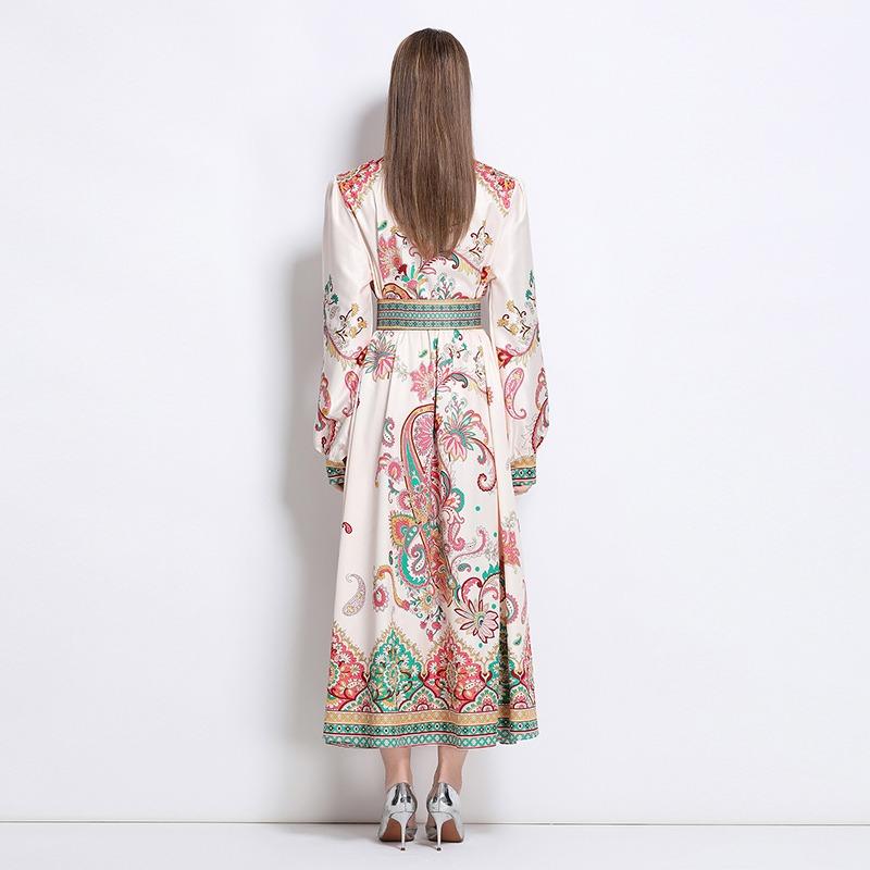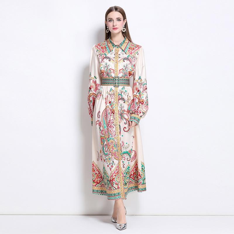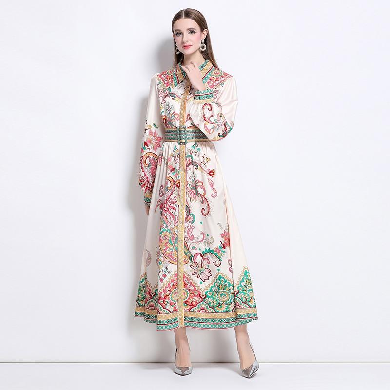Весна Осень Женские Винтажные Дизайнерские Платья с Принтом с Подиума Отложной Воротник Однобортное Длинное Макси Платье-Рубашка для Вечеринки с Поясом
