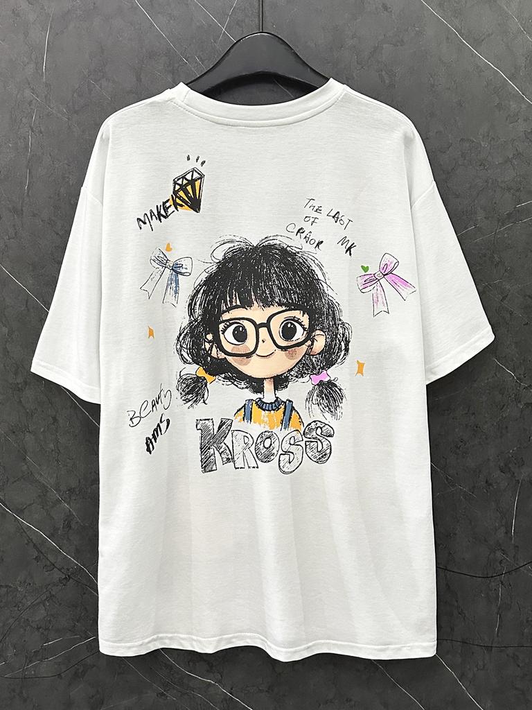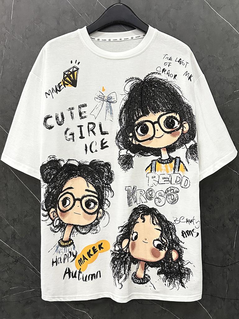 2025 Новая летняя женская модная брендовая удобная белая футболка с мультяшным принтом и круглым вырезом, повседневная