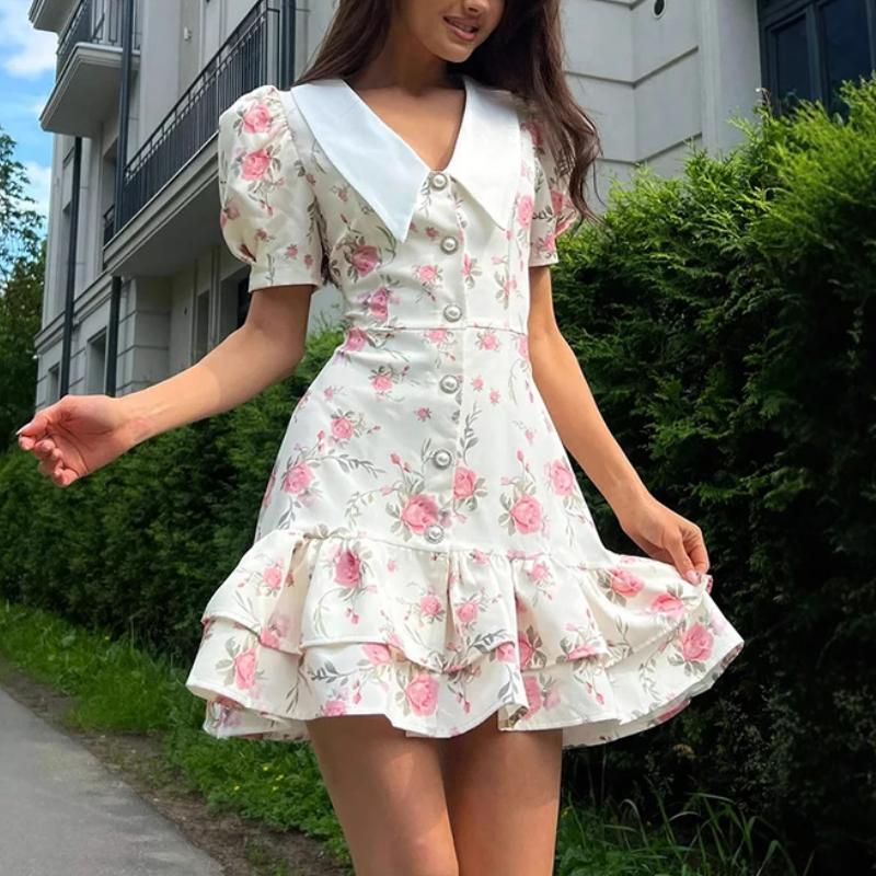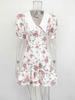 Летнее платье с принтом, пышными рукавами и оборками, женское платье мини с V-образным вырезом, высокой талией и жемчужными пуговицами, женское повседневное модное платье для отпуска