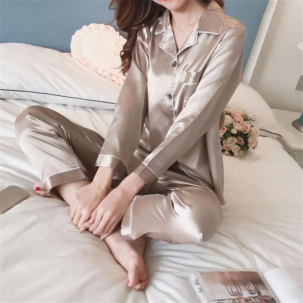 Пижамы женские шелковистые атласные пижамы комплект с длинным рукавом ночная одежда домашняя одежда