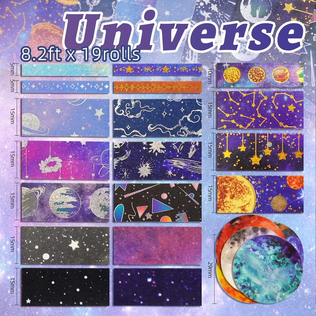 Космическая Одиссея: Этот набор васи-ленты имеет темный основной цвет и красиво оформлен изображениями созвездий, пентаграмм, туманностей, различных планет, звезд, Млечного Пути и т. д.. Также есть предварительно нарезанные планетарные ленты, и креативные дизайны наверняка станут вашими любимыми.