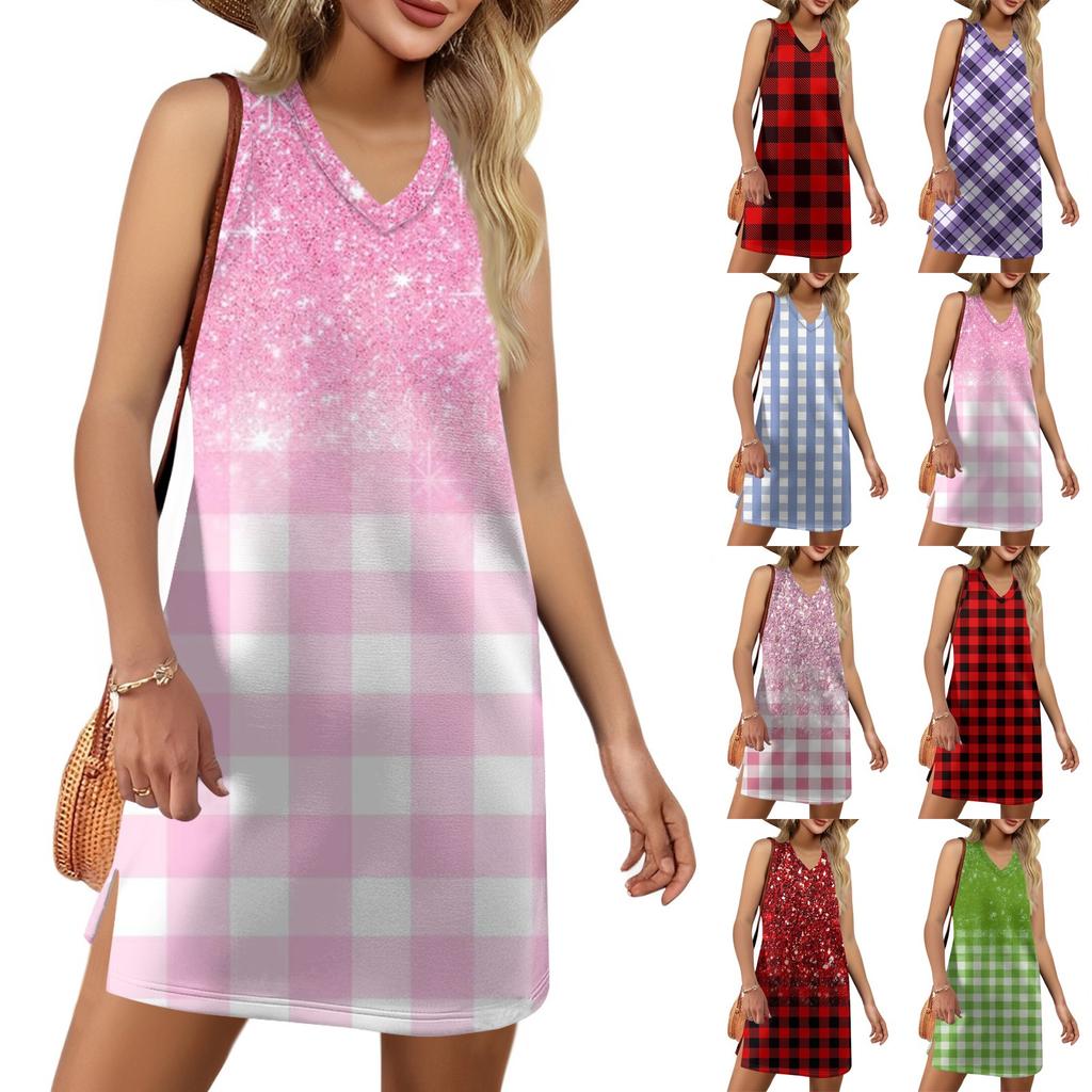 Женский летний повседневный сарафан без рукавов с V-образным вырезом и принтом в клетку для пляжного отдыха