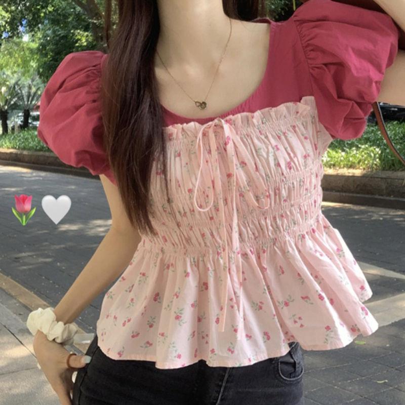Милая блузка с пышными рукавами и тонкой сборкой, летняя, с принтом из ломаных цветов, комбинированная, женская одежда, с круглым вырезом, модная, с кулиской и бантом на талии