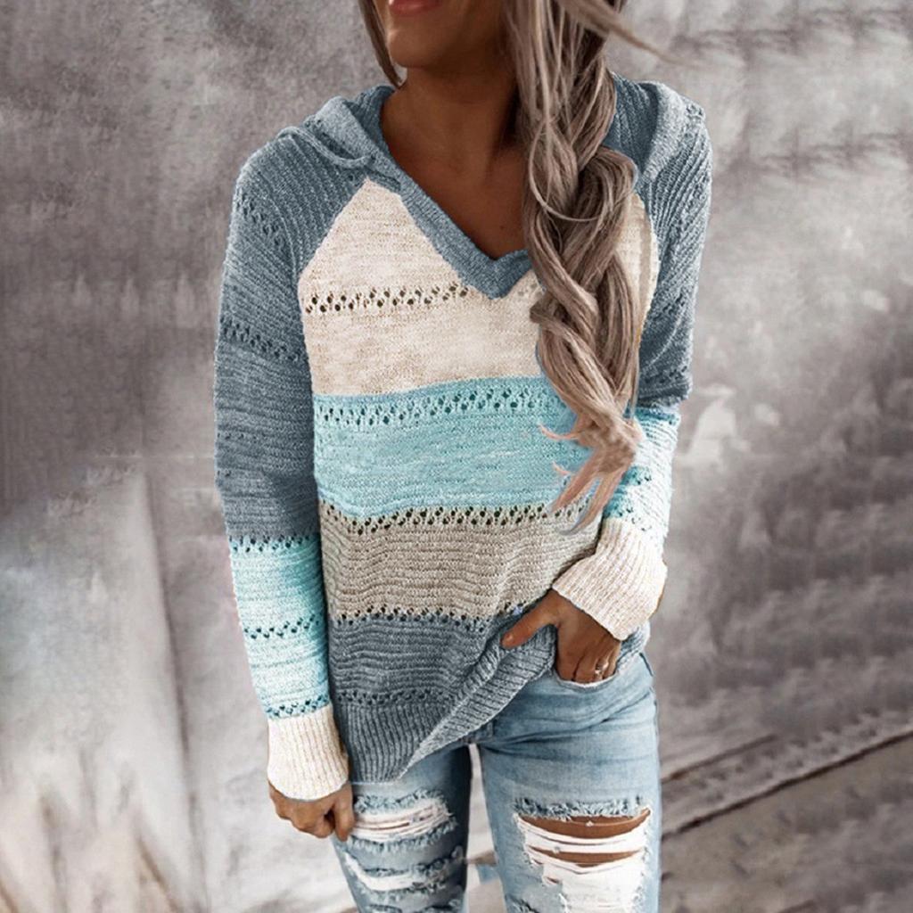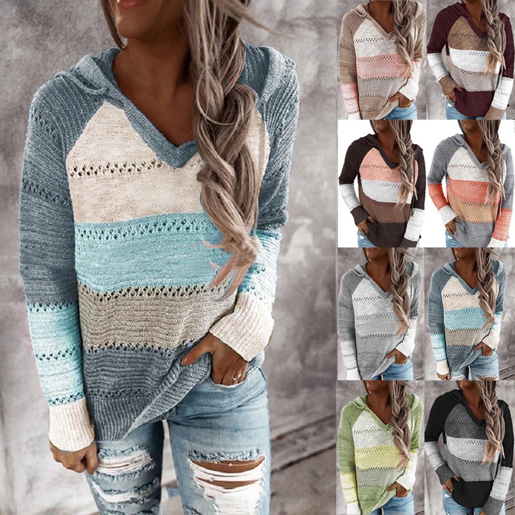 Модные женские повседневные пэчворк с v-образным вырезом и длинными рукавами с капюшоном и блузкой