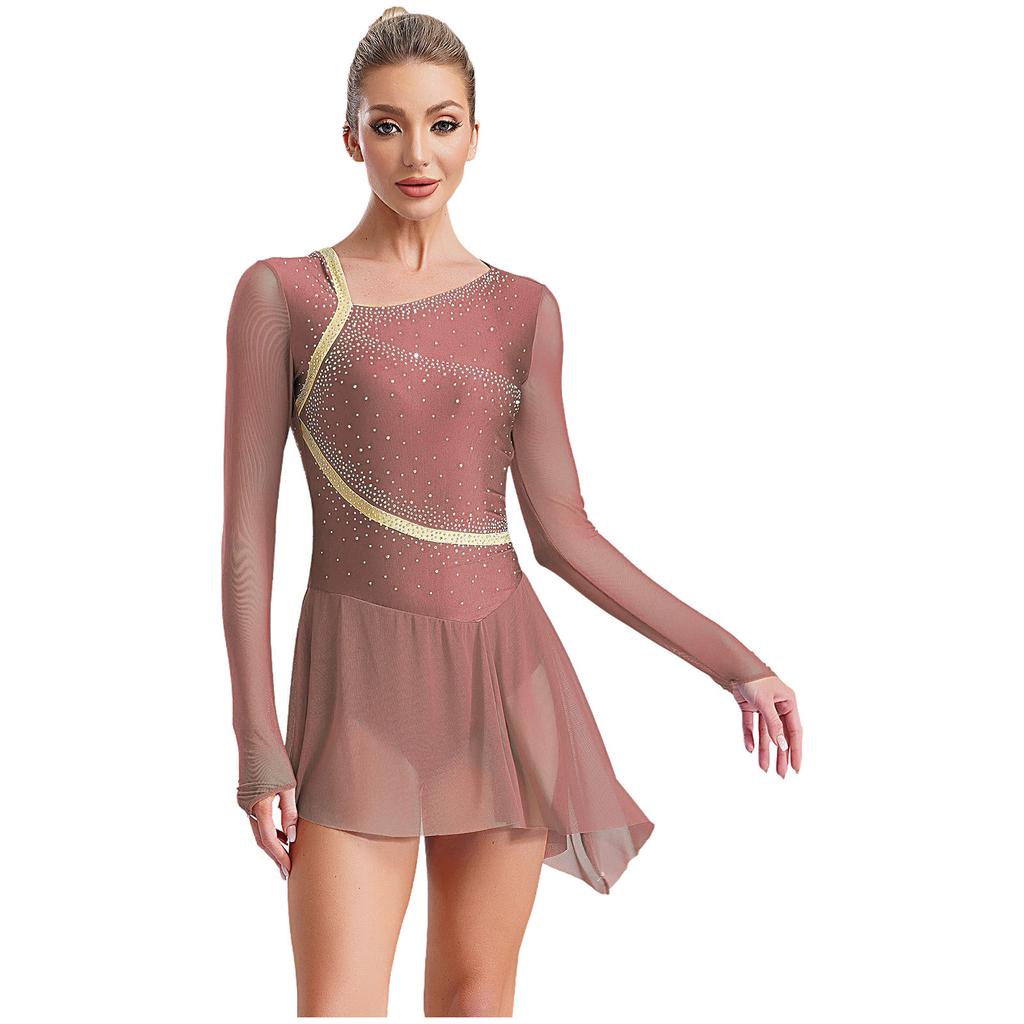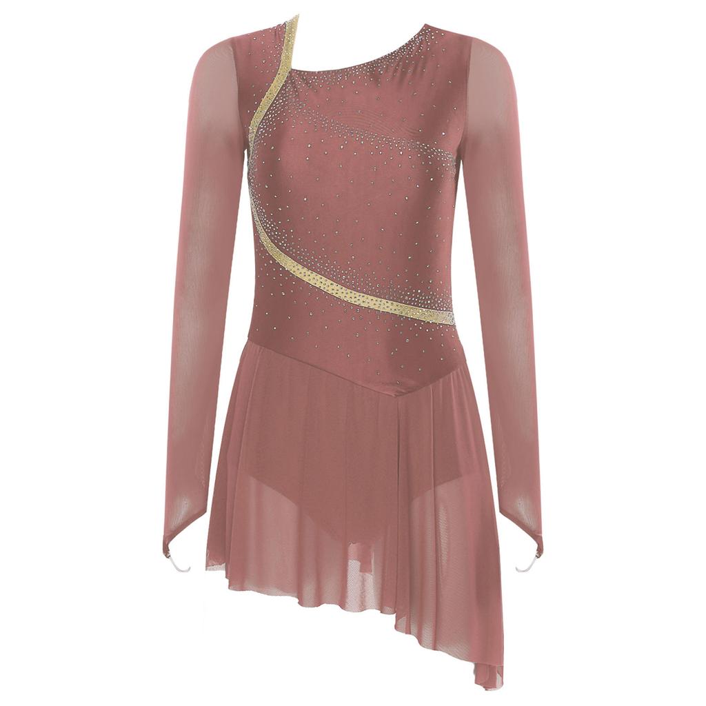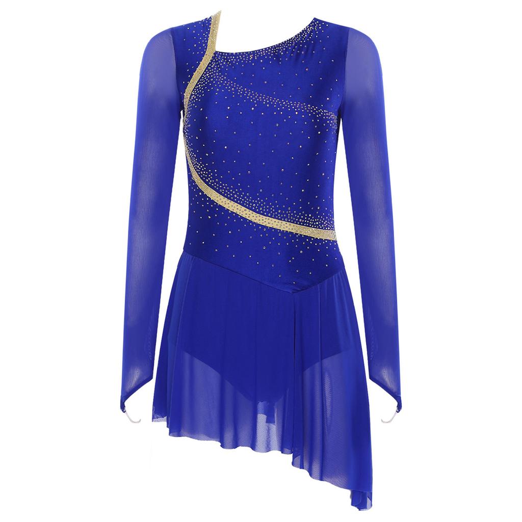 Женское платье для лирического танца из прозрачной сетки с длинными рукавами, открытой спиной, стразами и асимметричной юбкой, платье для фигурного катания